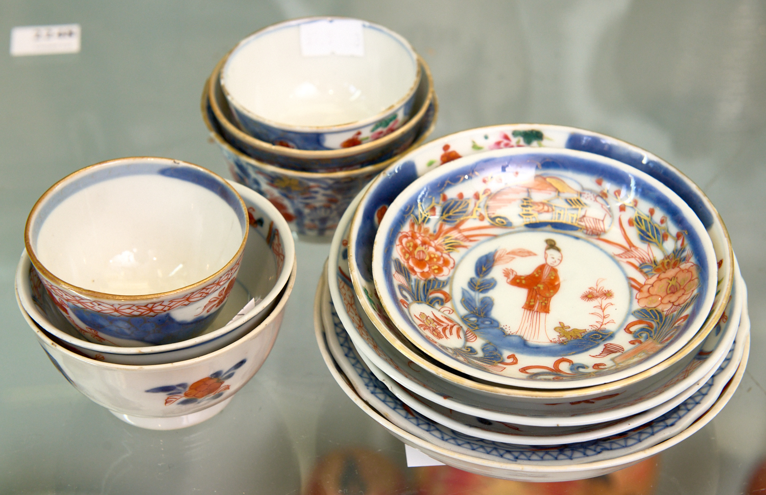 In various patterns, four matching sets and two matched. Five in classic Chinese Imari colours of blue, red and gilding, the last in famille rose palette.