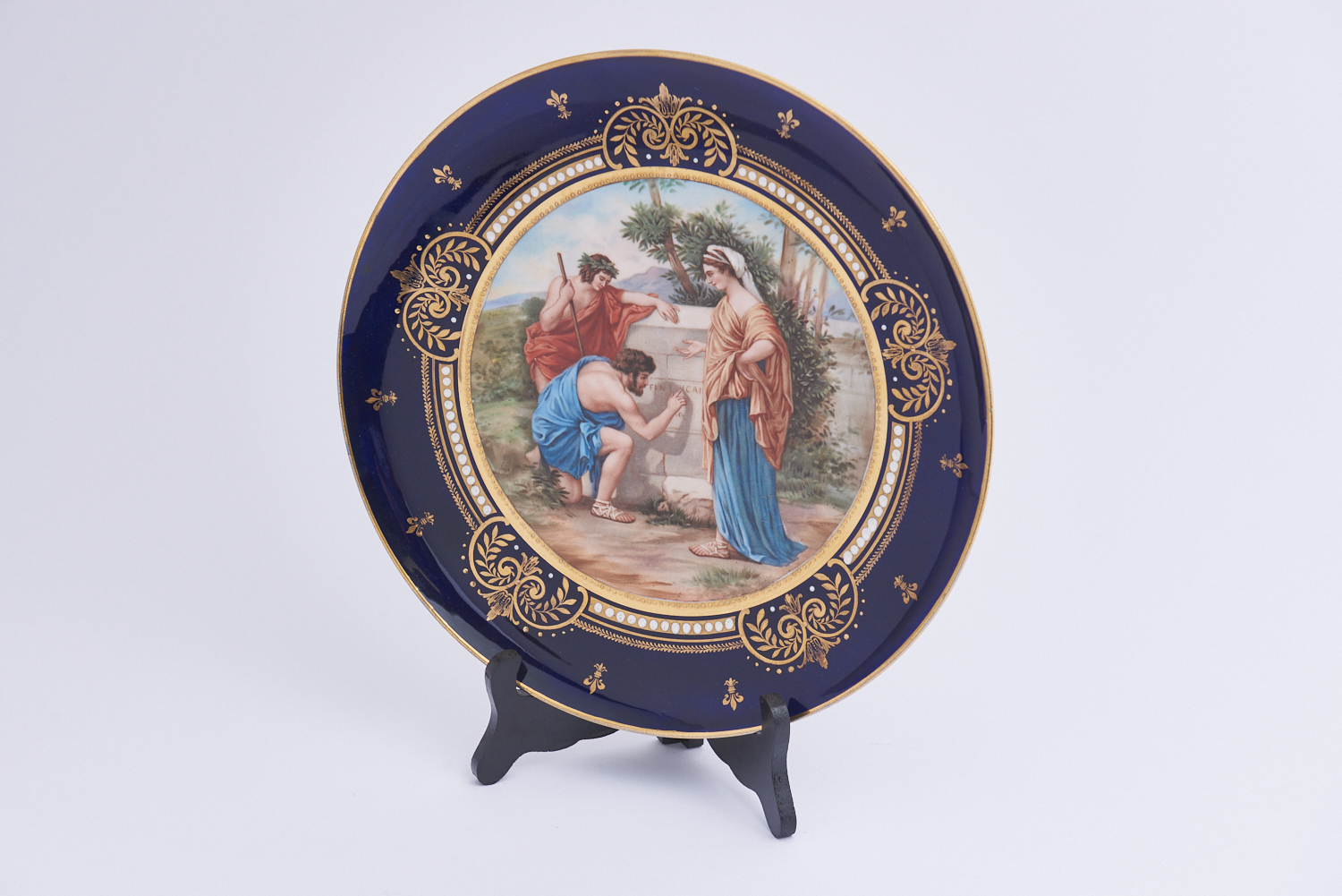 A VIENNA TYPE CHARGER, THE CENTRAL RESERVE DEPICTING A NEOCLASSICAL SCENE, THE BLUE RESERVE GILDED AND JEWELLED WITH WHITE ENAMEL, UNDERGLAZE BEEHIVE MARK TO VERSO, DIA.30CM, LEONARD JOEL LOCAL DELIVERY: SMALL