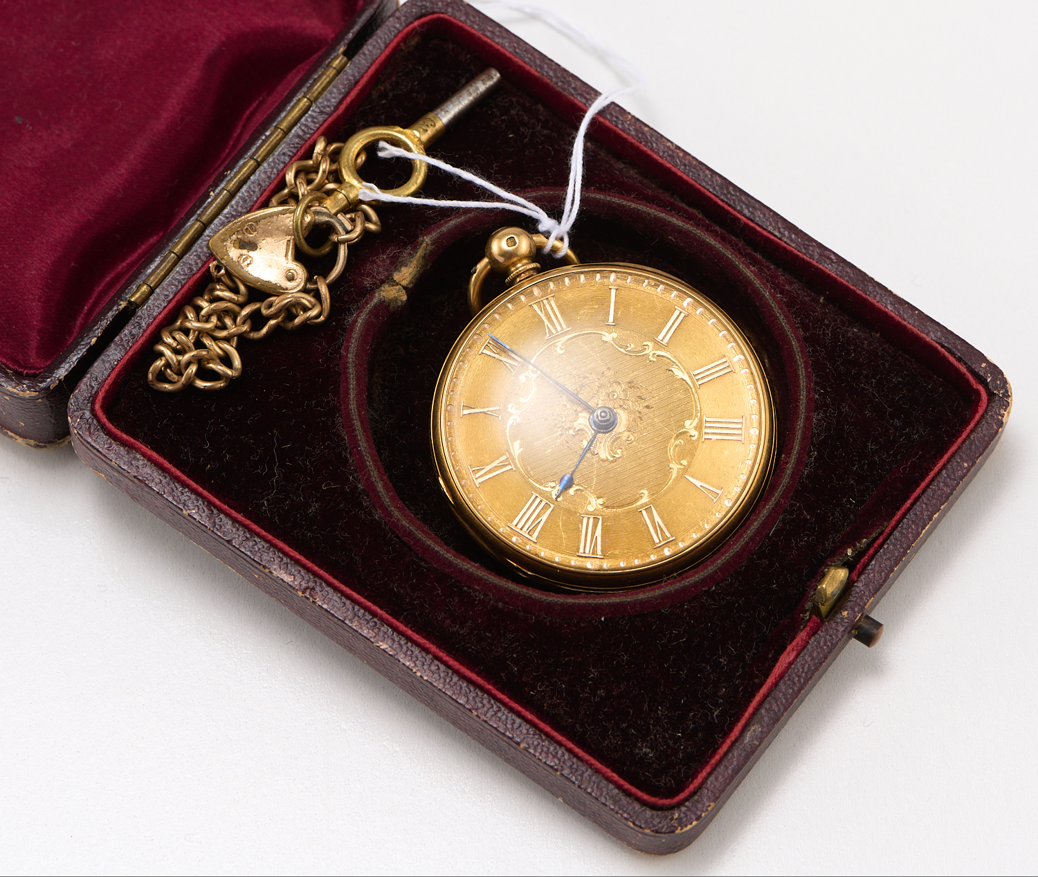 AN ENGLISH FUSEE LEVER POCKET WATCH IN 18CT GOLD, DIAMETER 40MM, 56.1GMS, BOXED