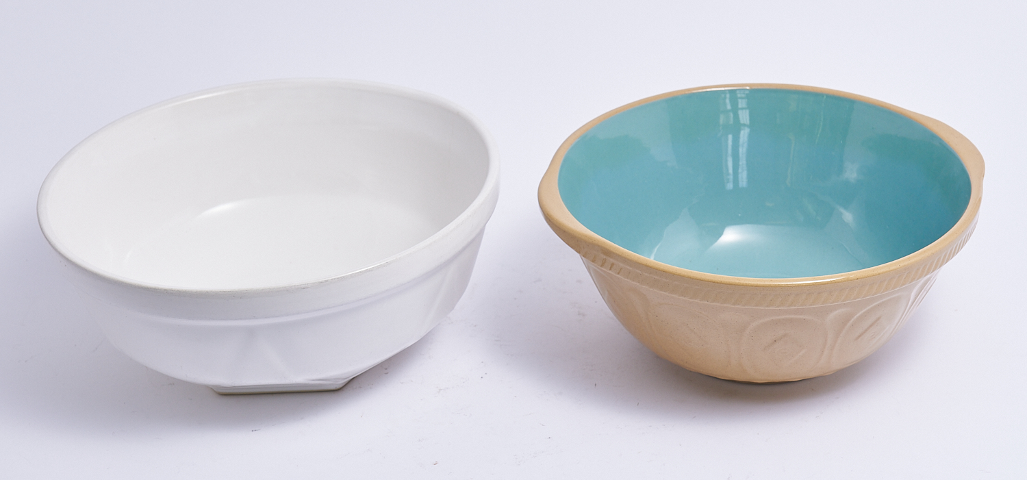 TWO EARLY 20TH CENTURY ENGLISH GLAZED POTTERY MIXING BOWLS INCLUDING T.G.GREEN GRIPSTAND DIA.30CM (LARGEST), LEONARD JOEL LOCAL DELIVERY: MEDIUM