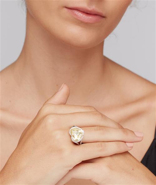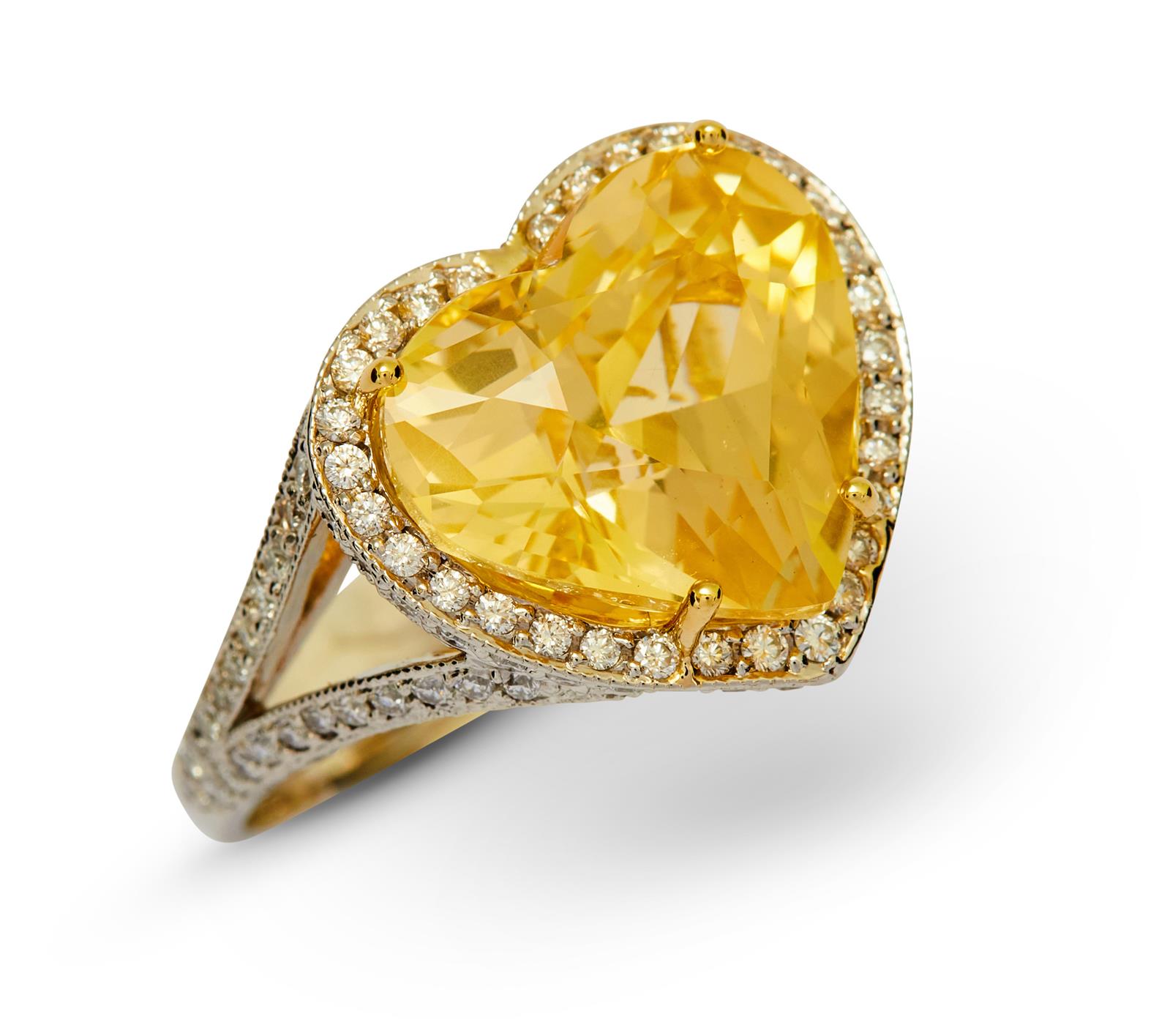Modelled as a cluster, claw-set with a heart-shaped modified brilliant-cut Sri Lankan yellow sapphire weighing 10.17 carats, framed by pavé-set brilliant-cut diamonds supported from a gallery pierced and millegrain-set with diamonds to similarly set split shoulders, the brilliant-cut diamonds together weighing approximately 1.11 carats, mounted in platinum and 18ct gold, size P.
