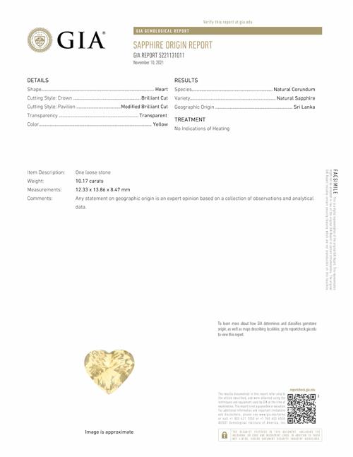 Accompanied by a GIA report numbered 5221131011, dated 10 November 2021, stating that the 10.17 carat yellow sapphire is natural, with no indications of heating, of Sri Lanka origin.