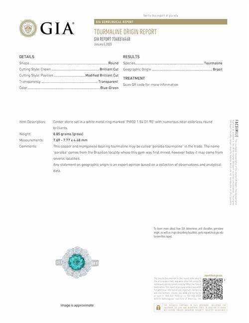 Accompanied by a GIA report numbered 7348316468, dated 6 January 2020, stating that the 1.54 carat blue-green tourmaline is of Brazil origin.