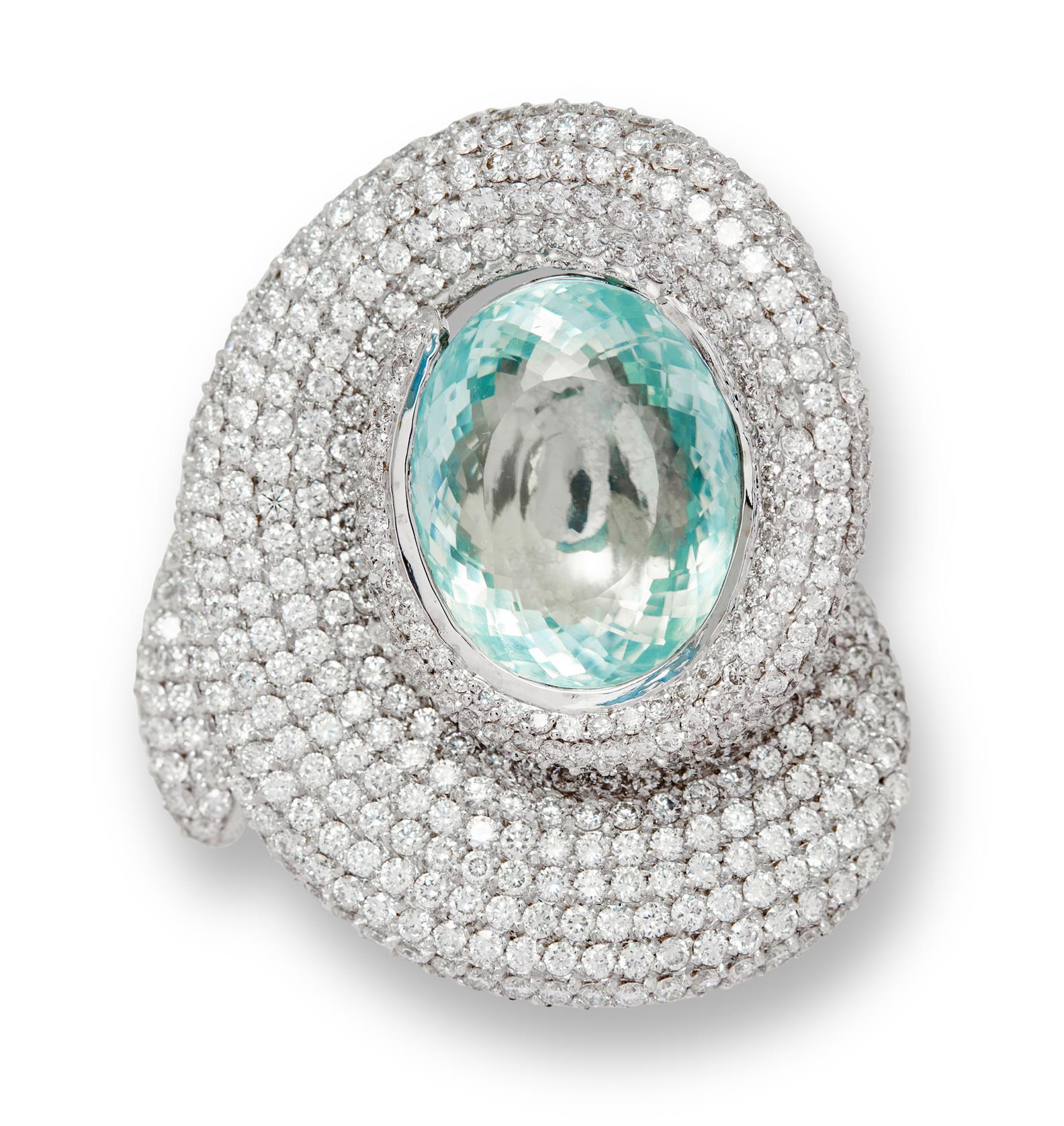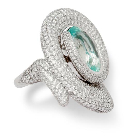 Of cluster design, centring a collet-set oval Paraíba-type tourmaline weighing 20.82 carats, framed by an assymetrical undulating openwork surround pavé-set with brilliant-cut diamonds, the diamonds together weighing approximately 7.50 carats, mounted in 18ct white gold, size N.