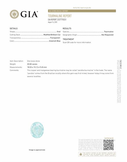 Accompanied by a GIA report numbered 2357778331, dated 14 August 2020, stating that the 20.82 carat tourmaline is of greenish-blue colour.