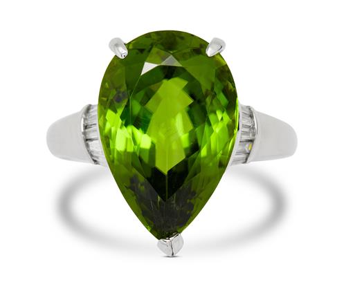 The pear-shaped peridot stated to weigh 13.91 carats, is claw-set between channel-set baguette-cut diamond shoulders, the diamonds together weighing approximately 0.17 carats, mounted in platinum, size V1/2.