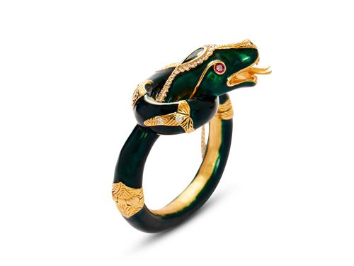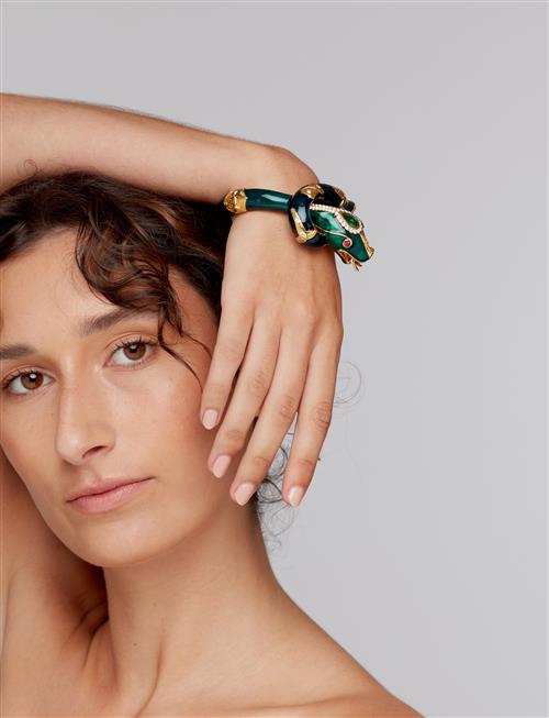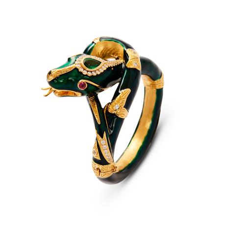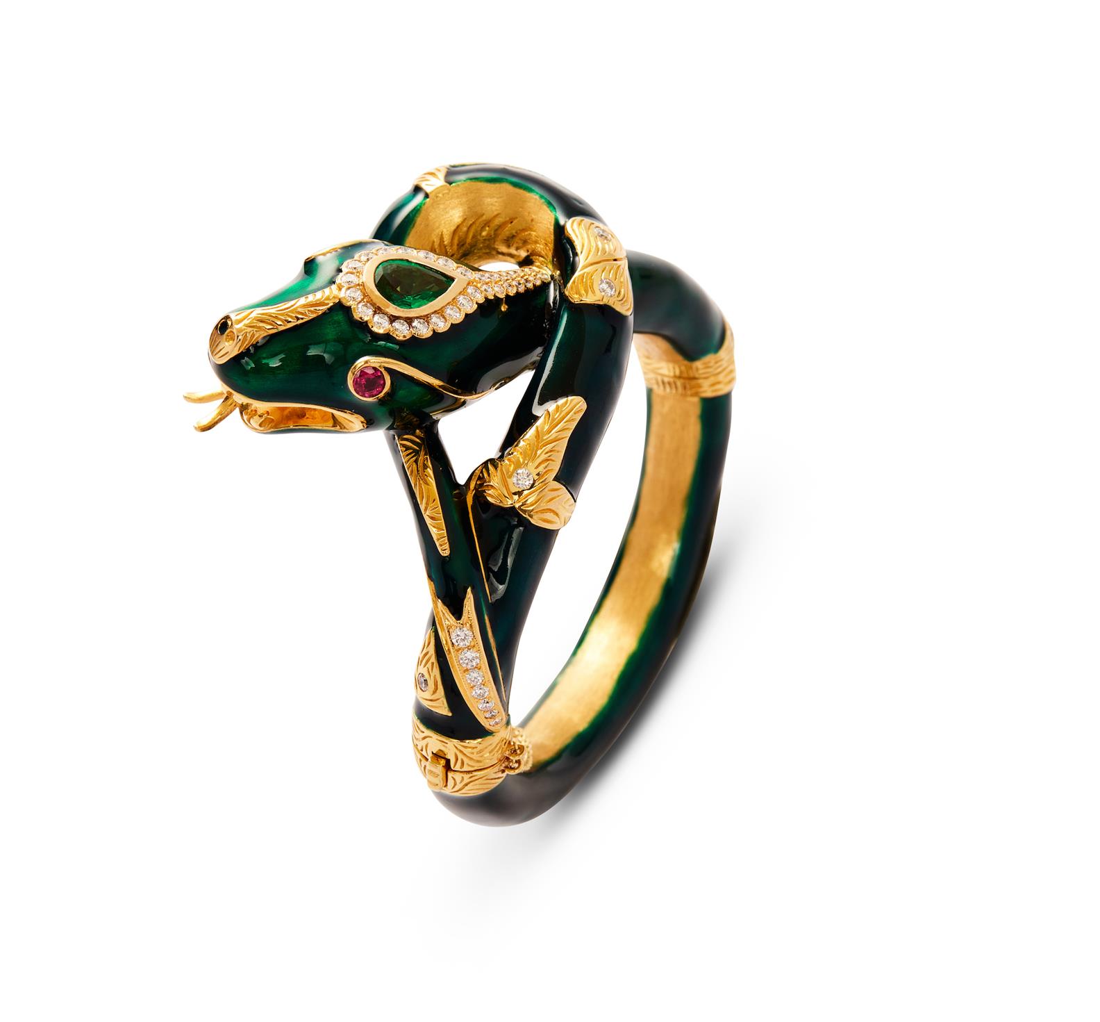 The oval hinged bangle modelled as an enamelled coiled snake, the head decorated with a pear-shaped emerald framed by brilliant-cut diamonds, the eyes collet-set with circular-cut rubies, the body accented at intervals with textured gold foliate motifs highlighted with diamonds, the diamonds together weighing approximately 1.75 carats, inner circumference 170mm, gross weight approximately 60.00 grams.