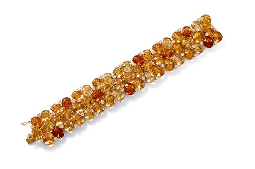 Modelled as a wide strap comprising of lines of flowerheads, the petals claw-set with variously coloured oval citrines between brilliant-cut diamond highlights completed by a concealed box clasp, the citrines and diamonds together weighing approximately 216.00 carats and 3.60 carats respectively, mounted in 18ct gold, width 37mm, length 190mm.