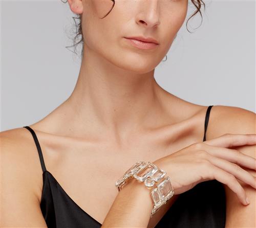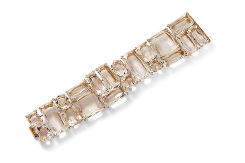 The wide 35mm strap of architectural design is claw-set with 20 variously cut rock crystals decorated at intervals with brilliant-cut diamonds, the rock crystals and diamonds together weighing approximately 313.50 carats and 0.15 carats respectively, mounted in 18ct gold, length 190mm, maker's mark for H.Stern.