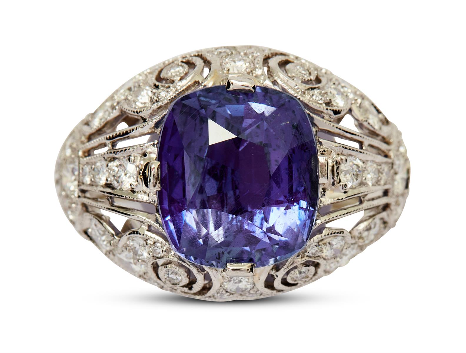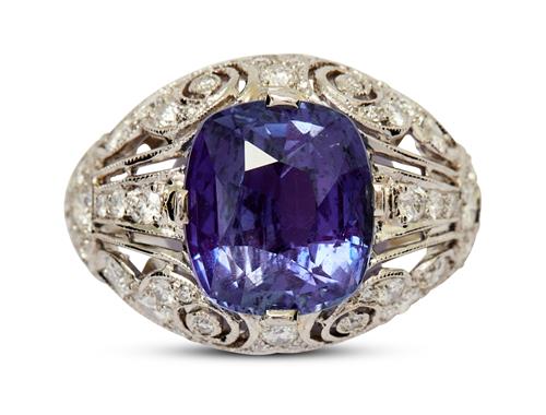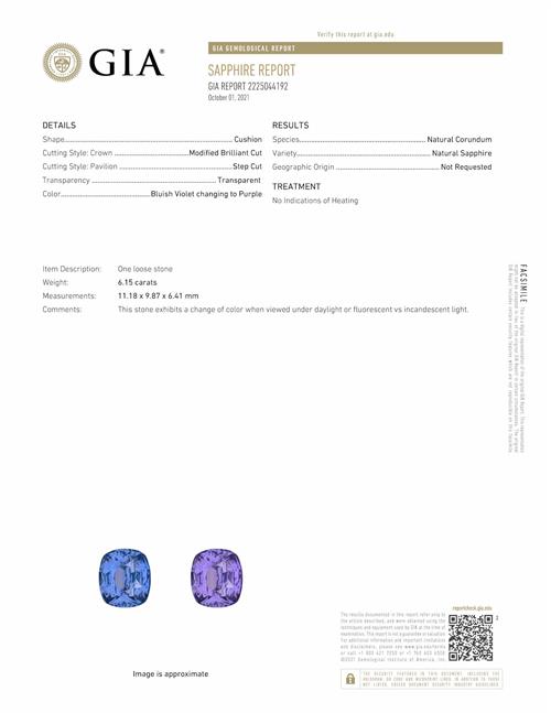 Accompanied by a GIA report numbered 2225044192, dated 1 October 2021, stating that the 6.15 carat bluish-violet changing to purple sapphire is natural, with no indications of heating.