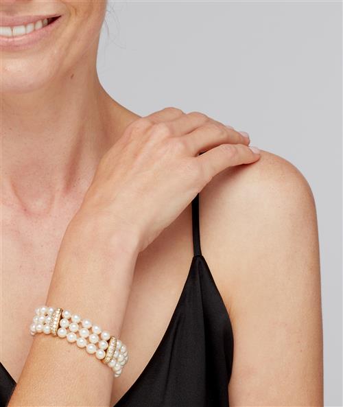 Composed of three strands of Akoya cultured pearls measuring approximately 6.50mm to 7.00mm, between three 18ct gold half round bombé spacers pavé-set with brilliant-cut diamonds completed by a similarly set clasp, length 180mm, clasp signed T & Co. for Tiffany & Co.