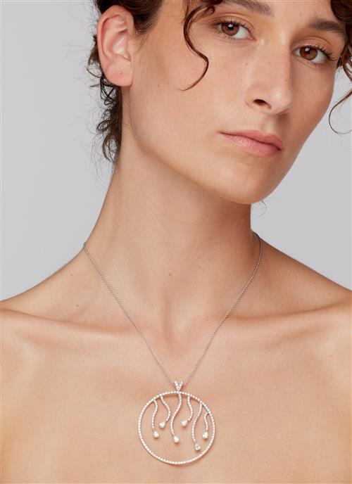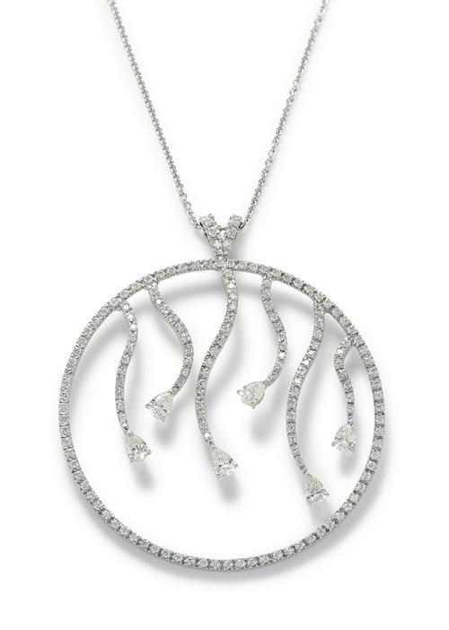 Modelled as an annular plaque pavé-set to the front with brilliant-cut diamonds, decorated at intervals with six lines of similarly set diamonds terminating in claw-set pear-shaped diamonds, supported from a trace link chain between a diamond set surmount, the diamonds together weighing approximately 3.00 carats, mounted in 18ct white gold, diameter 55mm, signed Zydo Italy.