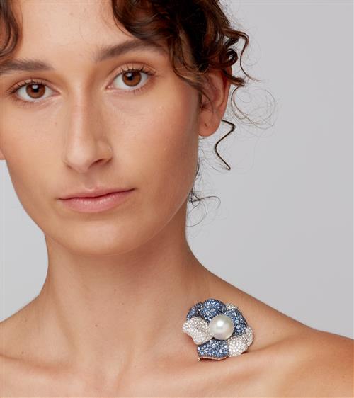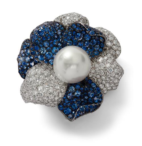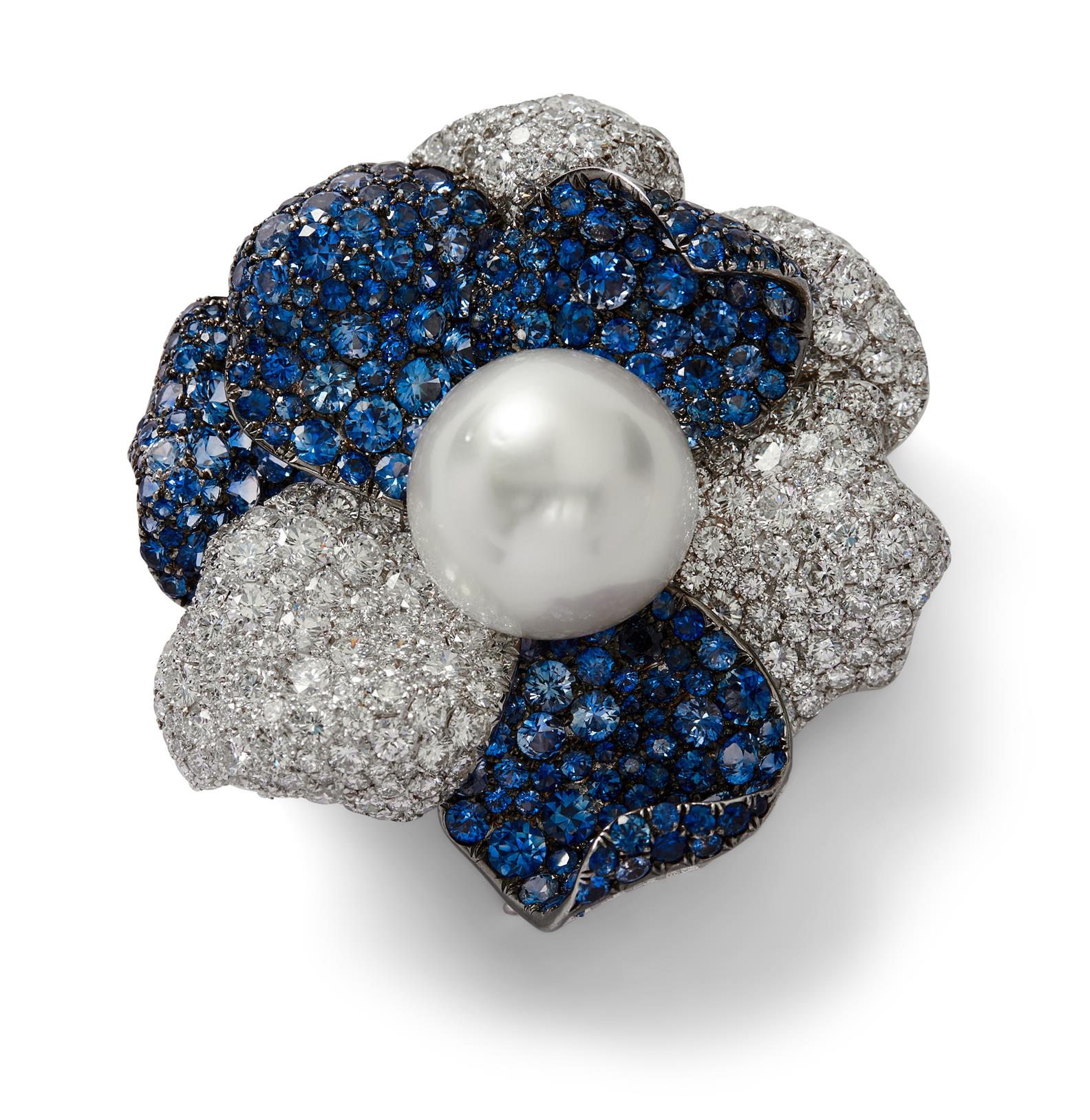 Modelled as a flowerhead, the stamen centring a cultured pearl measuring 17.60mm, above petals en tremblant pavé-set with circular-cut sapphires and brilliant-cut diamonds, the sapphires and diamonds together weighing approximately 15.00 carats and 17.00 carats respectively, mounted in 18ct white and blackened gold, diameter 50mm, trombone clip fitting, maker's marks, numbered, signed de Grisogono.