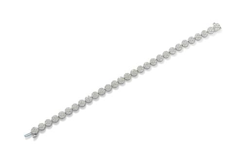 Composed of a line of 29 circular clusters claw-set with brilliant-cut diamonds, the diamonds together weighing approximately 5.00 carats, mounted in 14ct white gold, length 185mm.