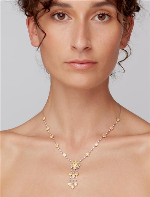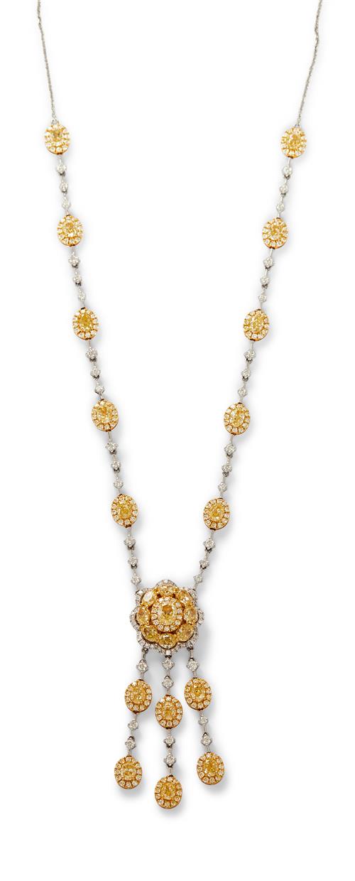 Composed of a trace chain decorated to the front with a line of clusters of diamonds of yellow tint between claw-set near colourless brilliant-cut diamond spacers supporting a fringe of three tassel pendants of similarly set diamonds, the diamonds together weighing approximately 8.70 carats, mounted in bicolour gold, pendant length 50mm, inner circumference 540mm to 440mm, adjustable.