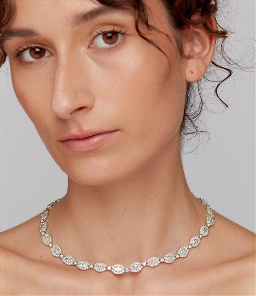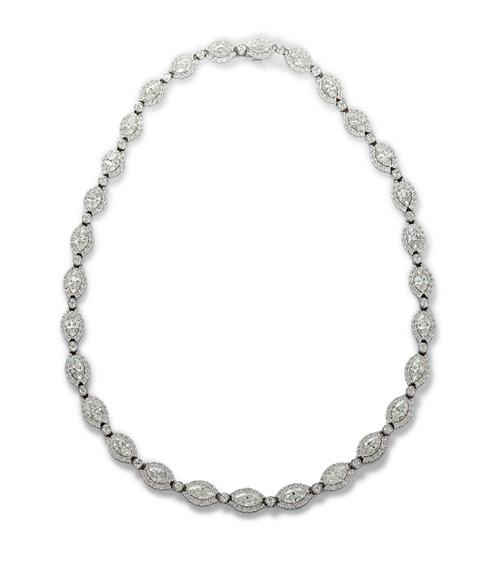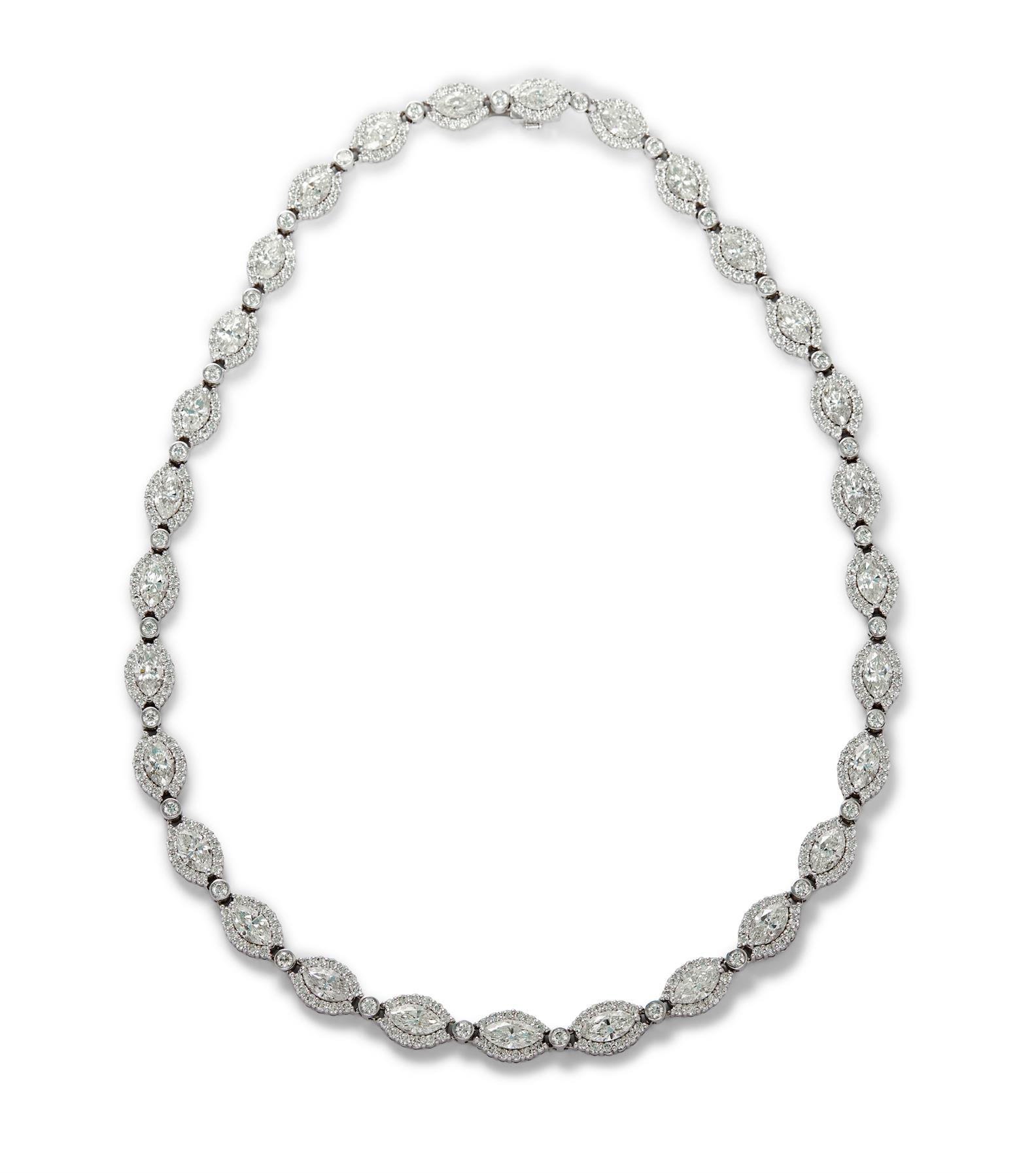 Modelled as an articulated line of 29 elliptical plaques each centring a claw-set marquise-shaped diamond framed by a halo of brilliant-cut diamonds between collet-set brilliant-cut diamond connectors, the marquise and brilliant-cut diamonds together weighing approximately 19.63 carats and 11.43 carats respectively, mounted in white gold, inner circumference 435mm.