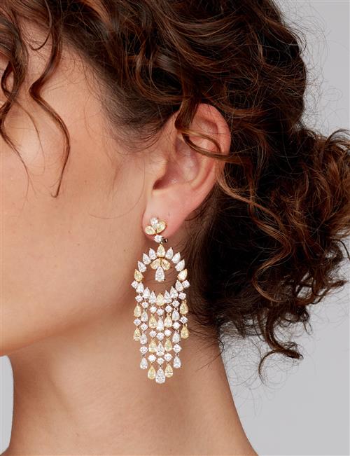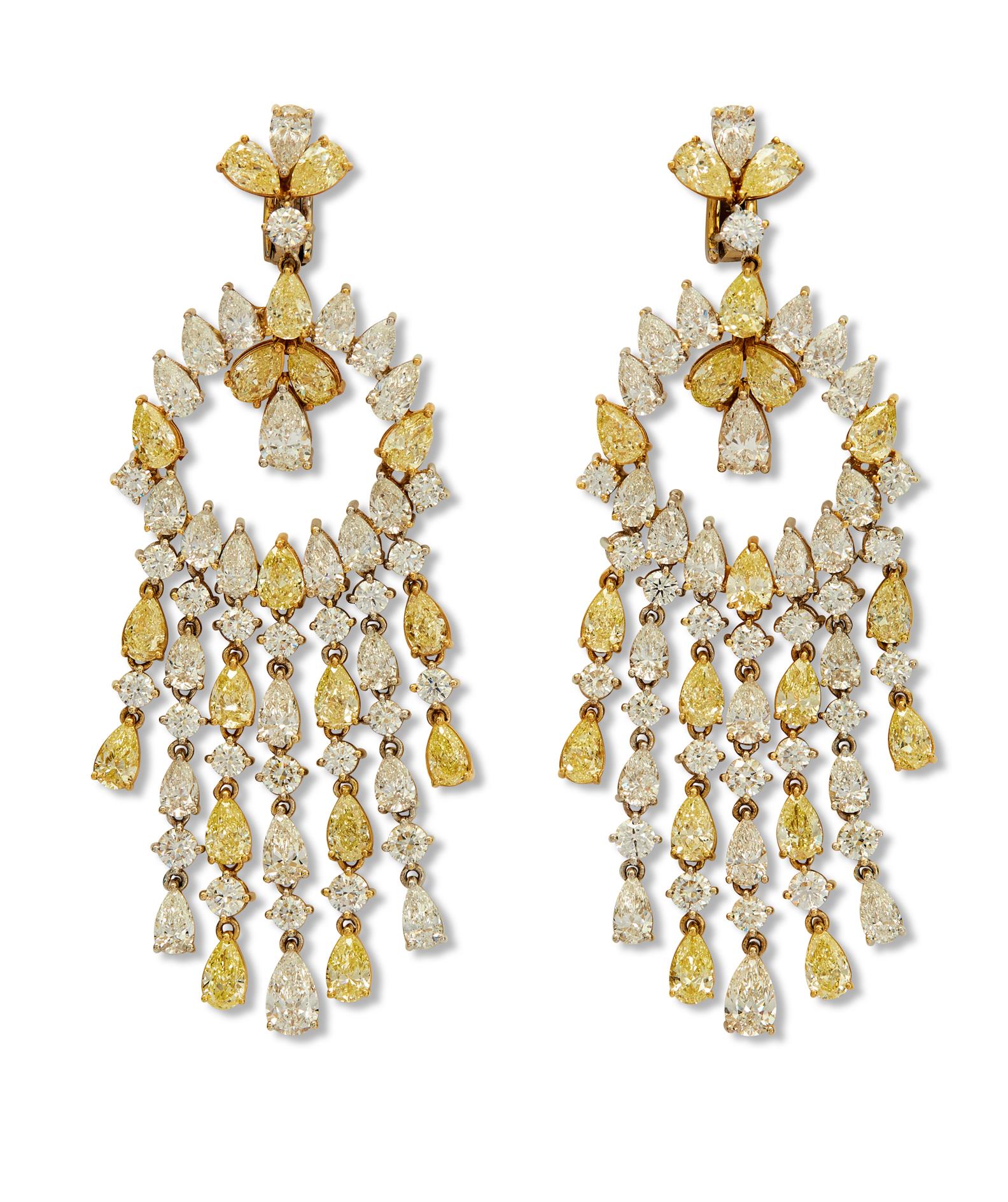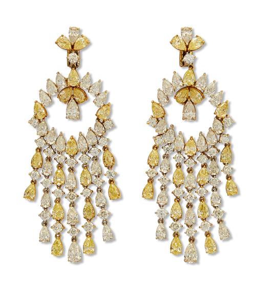 A STUNNING PAIR OF FANCY YELLOW DIAMOND AND DIAMOND CHANDELIER EARRINGS