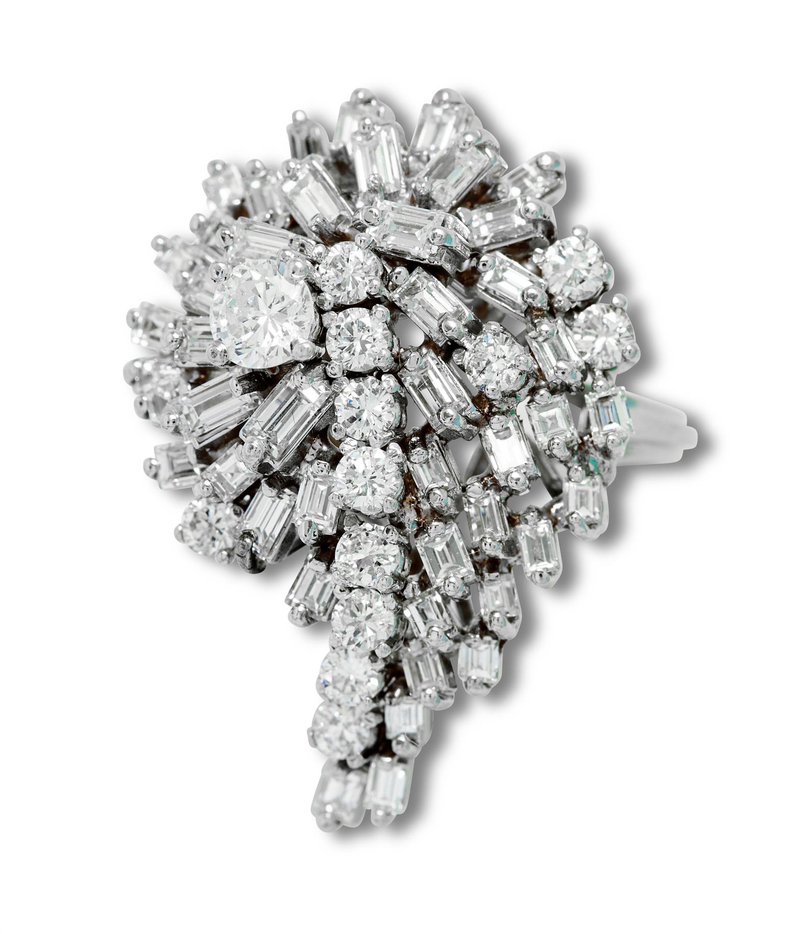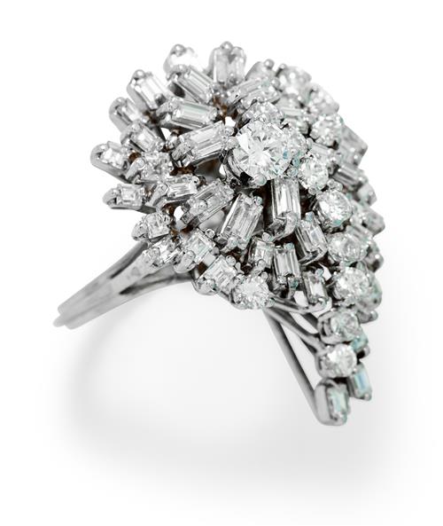 Of paisley design, the bombé cluster is claw-set with baguette and brilliant-cut diamonds, the diamonds together weighing approximately 2.80 carats, mounted in 18ct white gold, size M.