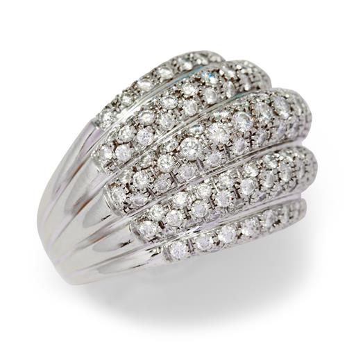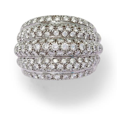 Modelled as a stack of five high half round bands pavé-set to the top with brilliant-cut diamonds, the diamonds together weighing approximately 2.50 carats, mounted in 18ct white gold, size O1/2.