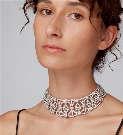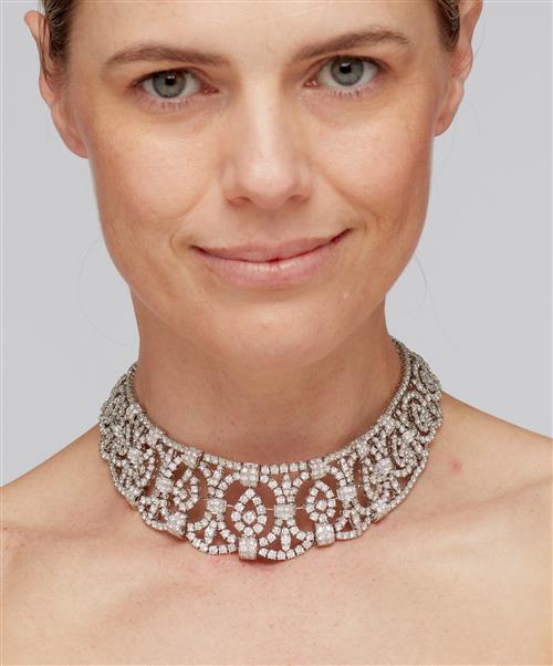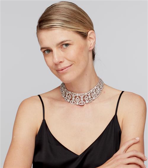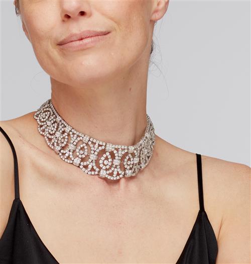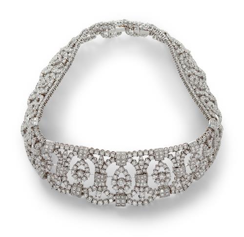 The graduated collar is composed of a line of openwork pear-shaped clusters claw-set with brilliant-cut diamonds, framed by lines of similarly set diamonds flanked at intervals with high half round dividers pavé-set with diamonds, the diamonds together weighing approximately 70.00 carats, mounted in 18ct white gold, inner circumference 330mm, signed Giovane, Italy.