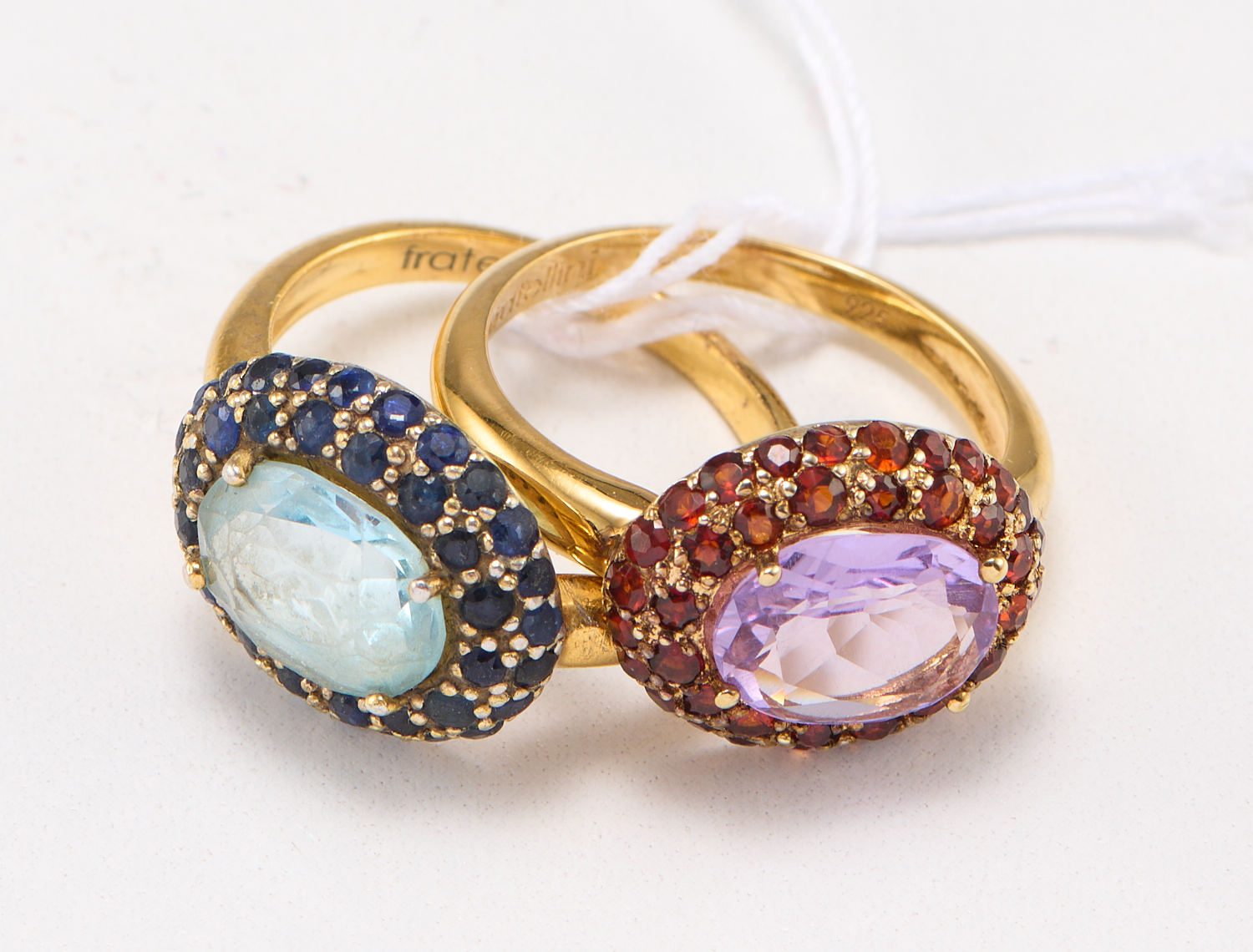 TWO GEM SET CLUSTER RINGS IN GOLD PLATED STERLING SILVER, RING SIZE N AND N/O