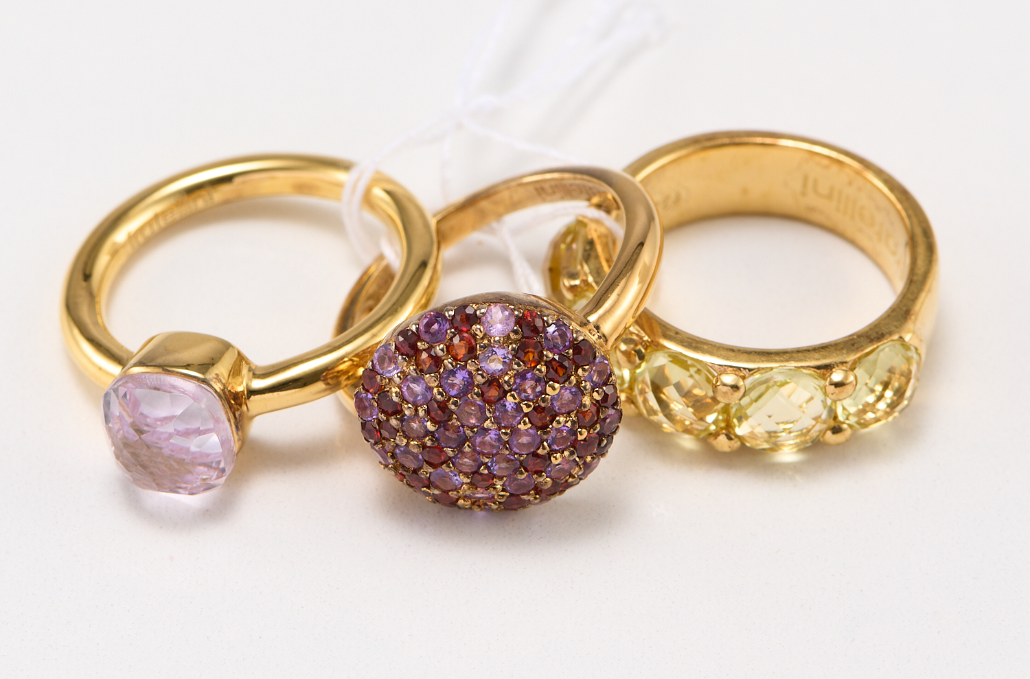 A COLLECTION OF THREE GEM SET RINGS IN GOLD PLATED STERLING SILVER, RING SIZES M AND N/O