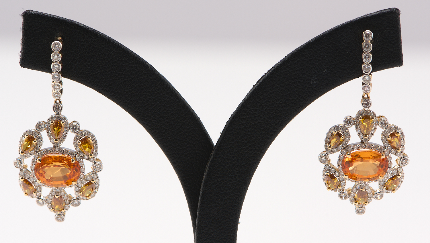A PAIR OF MANDARIN SPESSARTITE AND DIAMOND EARRINGS IN 14CT GOLD, THE TWO OVAL CUT SPESSARTITE TOTALLING 5.04CTS, FEATURING 12 PEAR CUT ORANGE DIAMONDS TOTALLING 1.37CTS, WITH SURROUNDING DIAMONDS TOTALLING 1.34CTS, TO POST AND LEVER BACK FITTINGS, DROP LENGTH APPROXIMATELY 36MM
