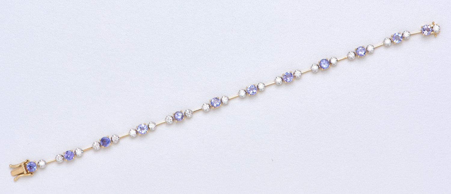 A TANZANITE AND DIAMOND BRACELET IN 14CT GOLD, THE TANZANITES TOTALLING 3.45CTS, THE DIAMONDS TOTALLING 1.36CTS