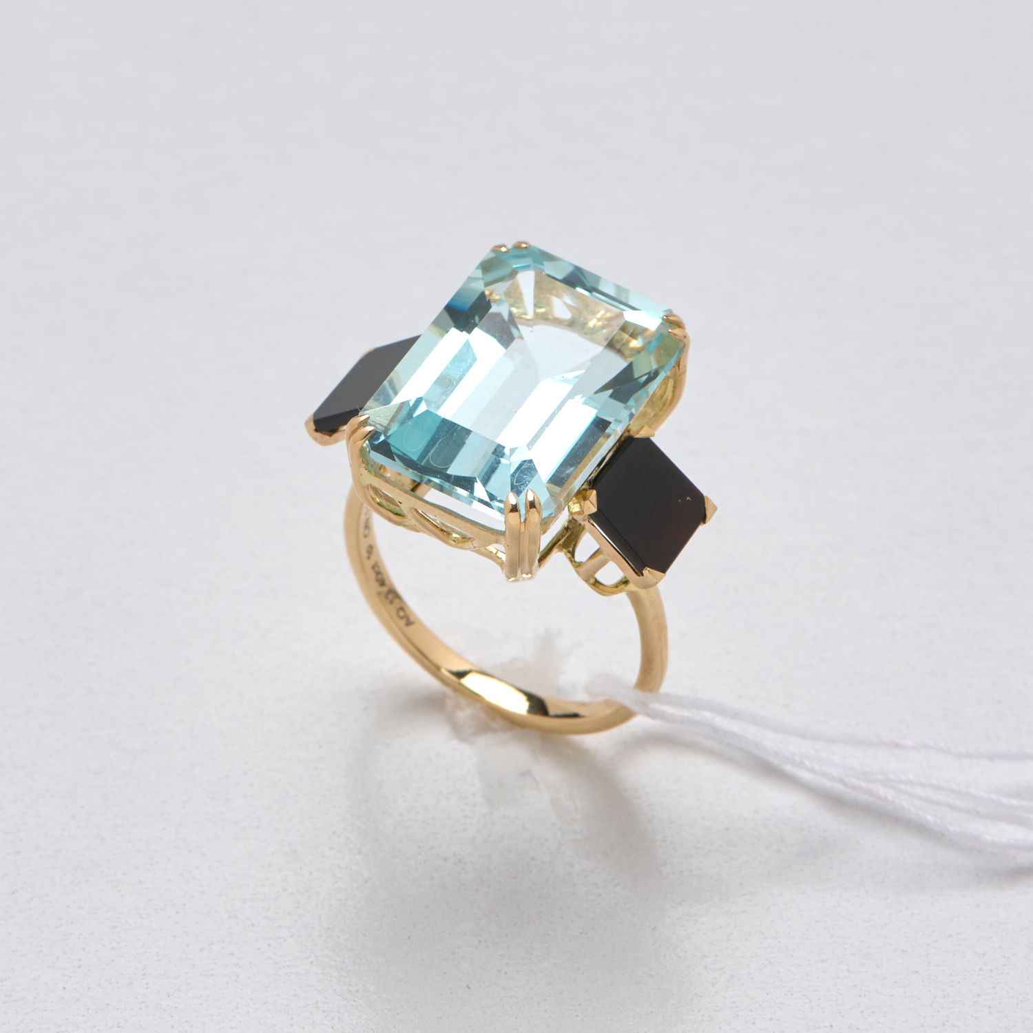 AN AQUAMARINE AND ONYX RING IN 14CT GOLD, RING SIZE O, THE AQUAMARINE TOTALLING 13.40CTS, THEE ONYX TOTALLING 1.06CTS