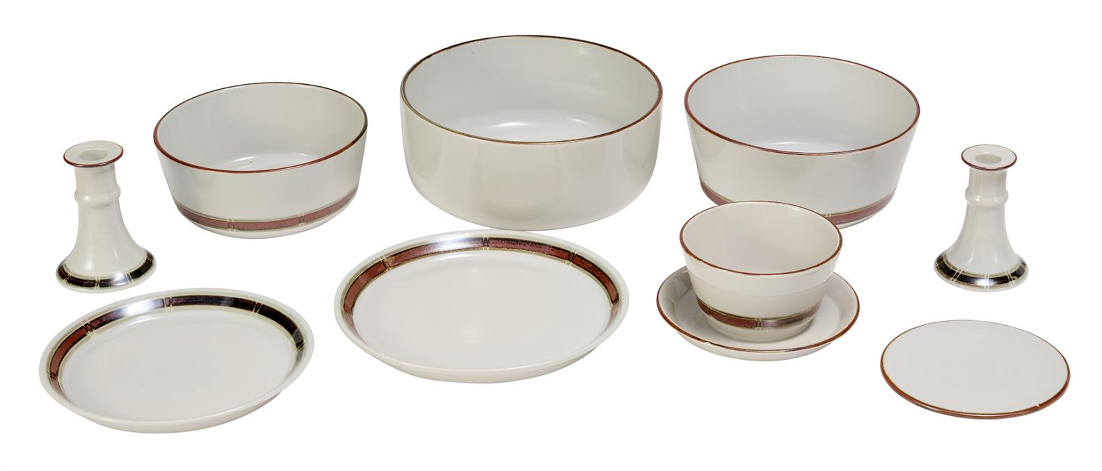Glazed ceramic in off-white with brown decorations. Includes twelve dinner plates, two dip bowls, six coasters, twelve side plates, one large serving plate, one large salad bowl, two medium salad bowls, one small salad bowl, two candle holders, and six small bowls.
