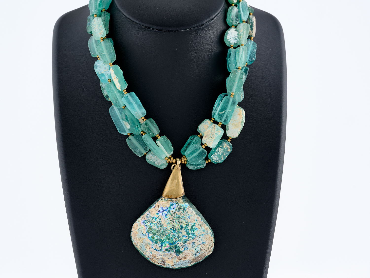 AN ARTISAN MADE ANCIENT ROMAN GLASS BEAD NECKLACE WITH BRASS DETAILS, THE PENDANT MEASURING APPROXIMATELY 80 X 60MM