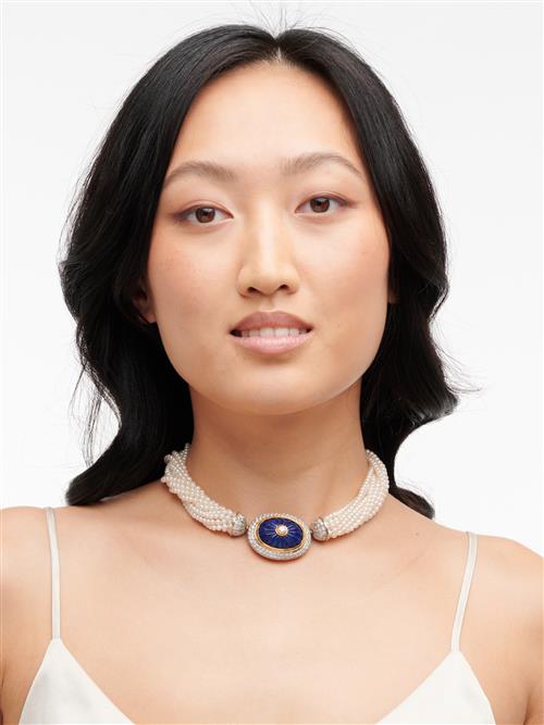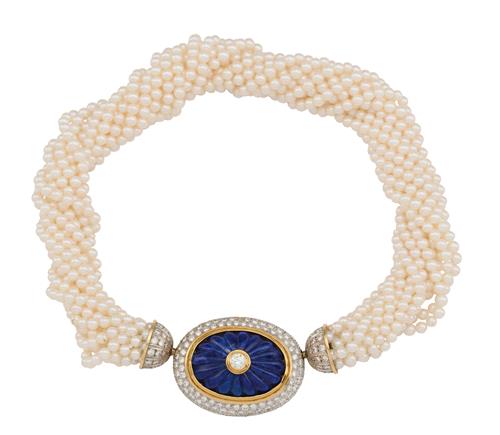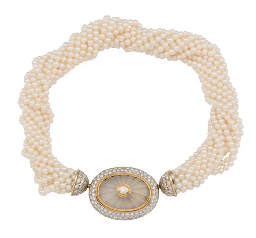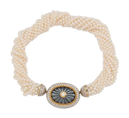 Centring an oval panel set with fluted rock crystal, collet-set with a brilliant-cut diamond at the centre, within a pavé-set diamond border, to a diamond capped pearl torsade, accompanied by interchangeable carved panels of hematite and lapis lazuli, clasp measuring 40mm x 29mm, overall length 380mm.
