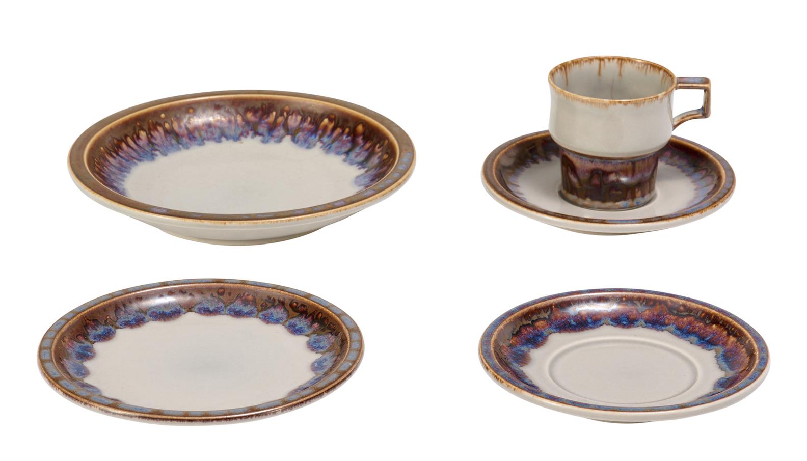 Glazed ceramic with textured detailing including ten teacups, eleven tea saucers, eleven coffee saucers, eight side plates, and one serving bowl.