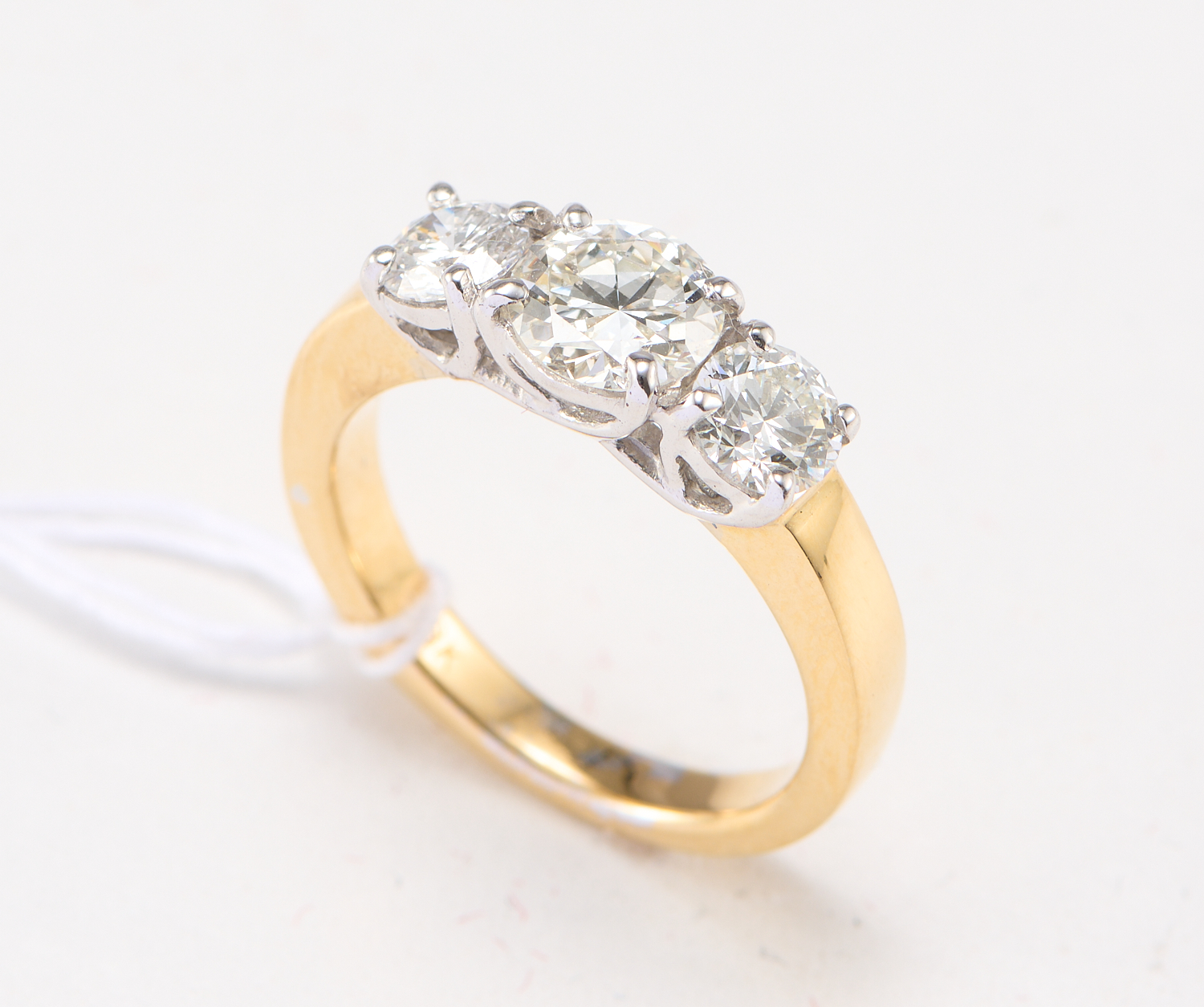A THREE STONE DIAMOND RING IN WHITE GOLD, THE DIAMONDS TOTALLING 1.77CTS, RING SIZE M