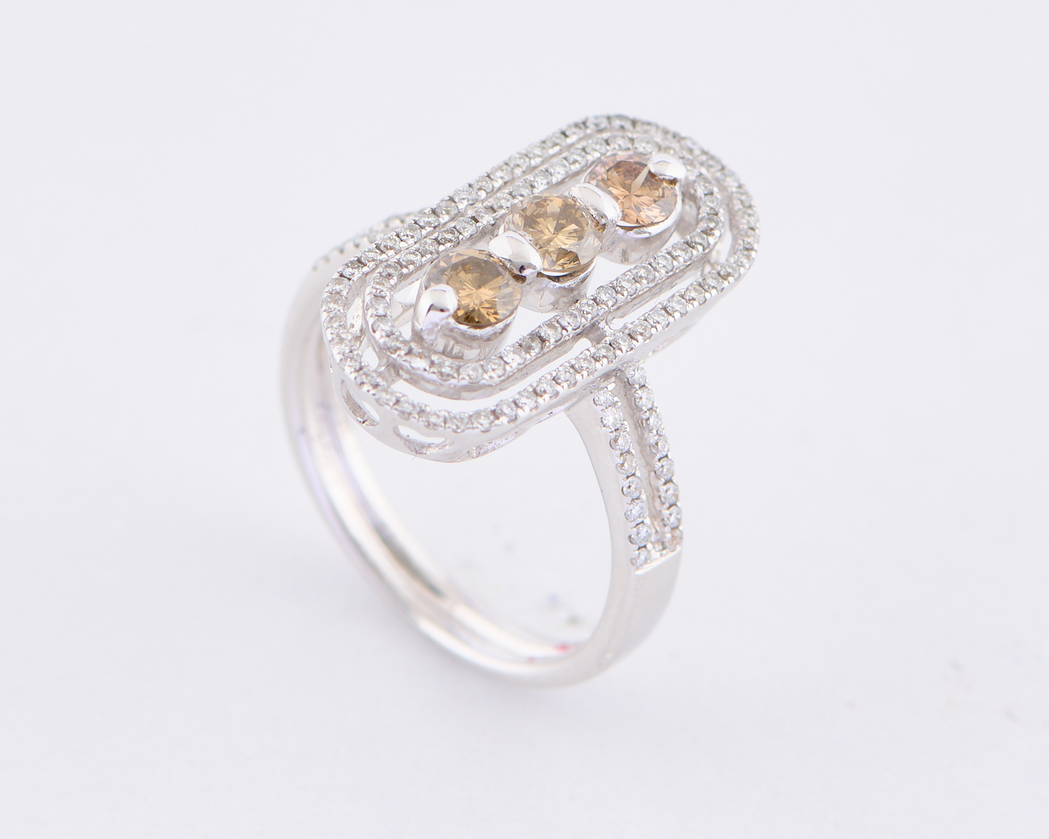 A COGNAC DIAMOND AND DIAMOND RING IN 18CT WHITE GOLD, THE COGNAC DIAMONDS TOTALLING 0.65CTS, THE DIAMONDS TOTALLING 0.38CTS, RING SIZE K, WEIGHT 4.79GMS