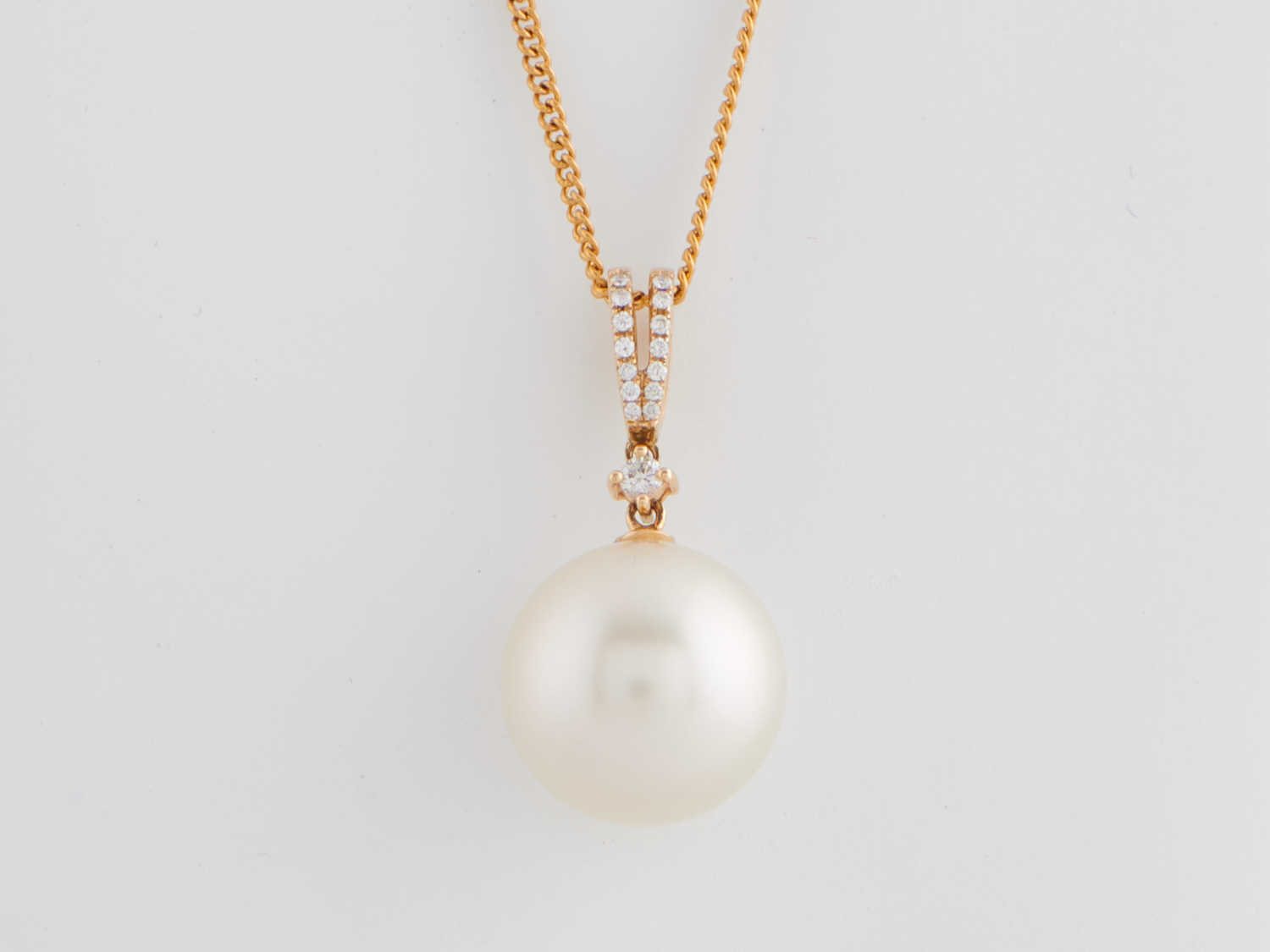 A SOUTH SEA PEARL AND DIAMOND SET PENDANT NECKLACE IN 18CT GOLD TO A CHAIN IN GOLD PLATE, THE DIAMONDS WEIGHING APPROXIMATELY 0.12 CTS, PEARL DIAMETER 14.7MM, PENDANT LENGTH 30MM, TOTAL WEIGHT 7.55GMS