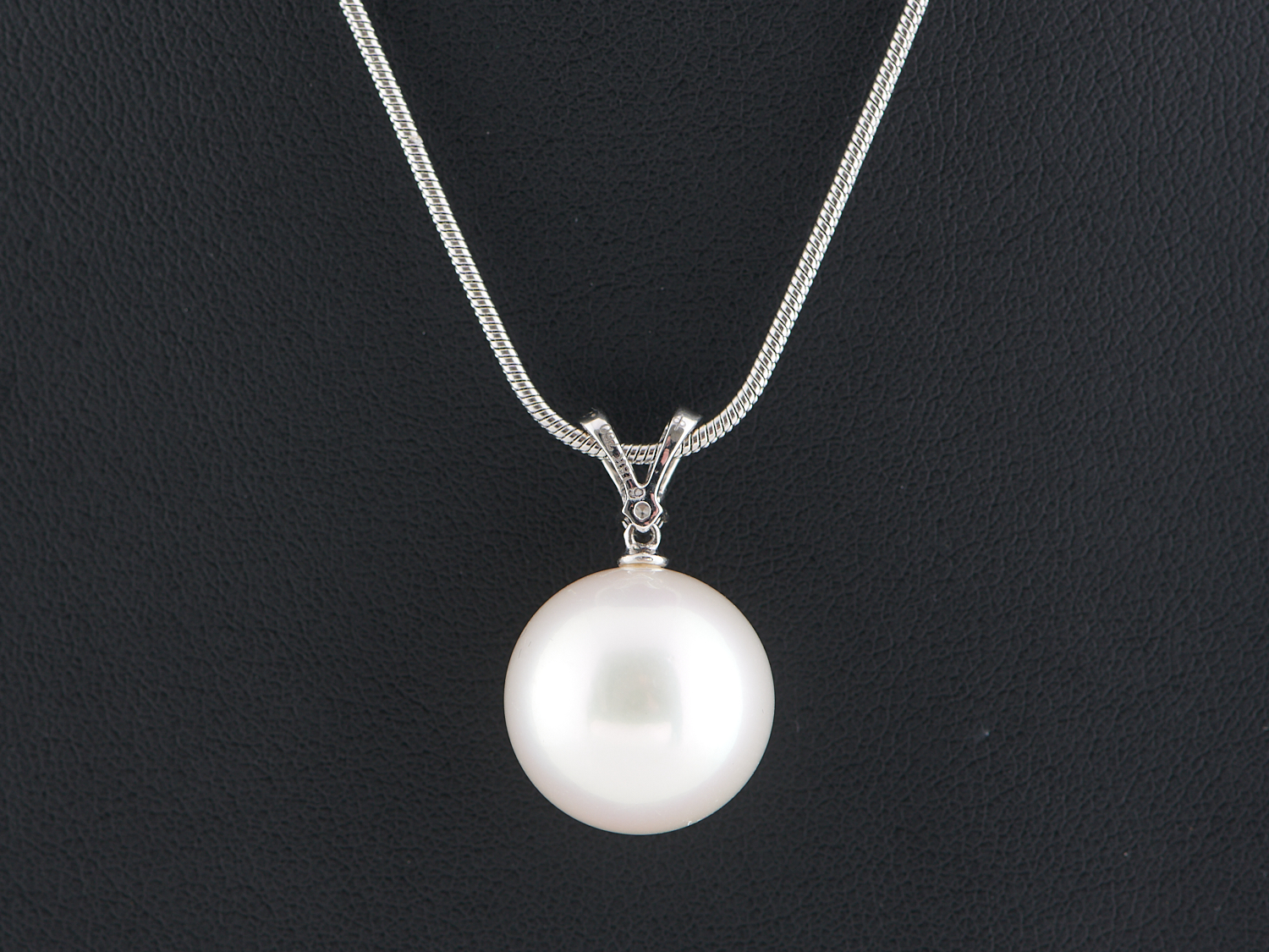 A SOUTH SEA PEARL AND DIAMOND PENDANT IN 18CT WHITE GOLD, COMPRISING A ROUND PEARL OF SILVER WHITE HUES MEASURING 15.7MM, TO A DIAMOND BALE TOGETHER WEIGHING 0.13 CARATS, LENGTH 24MM