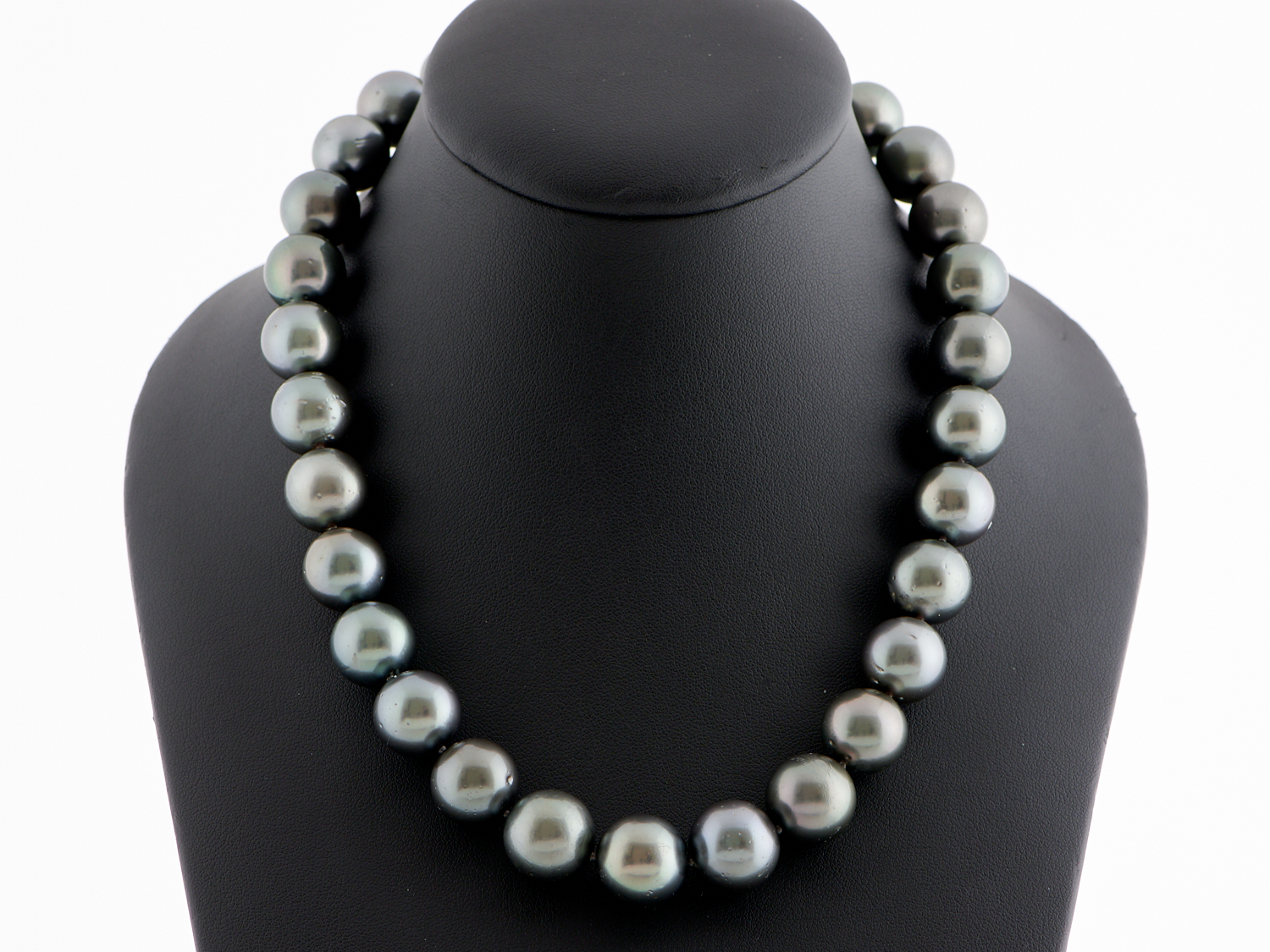 A STRAND OF TAHITIAN PEARLS COMPRISING TWENTY-NINE GRADUATING ROUND PEARLS OF DARK GREY-PEACOCK HUES MEASURING 12.6MM - 15MM, COMPLETED BY A 14CT GOLD BALL CLASP, LENGTH 430MM