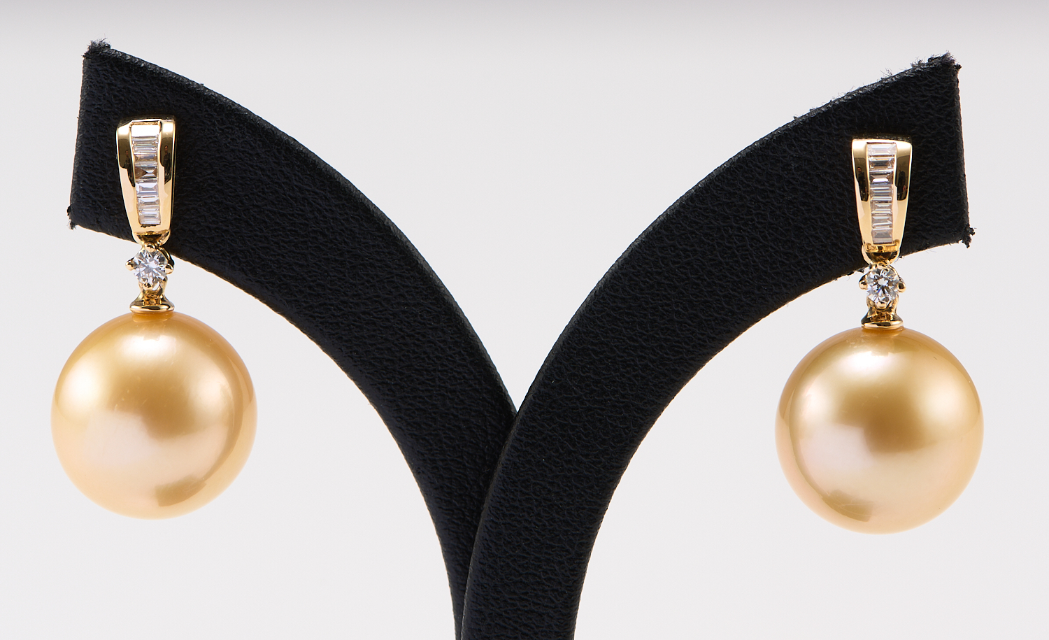 A PAIR OF SOUTH SEA PEARL AND DIAMOND EARRINGS IN 18CT GOLD, EACH EARRING COMPRISING A ROUND PEARL OF GOLDEN HUES MEASURING 13.6MM, SUSPENDED BELOW A DIAMOND SURMOUNT, TO POST AND BUTTERFLY FITTINGS, LENGTH 26MM