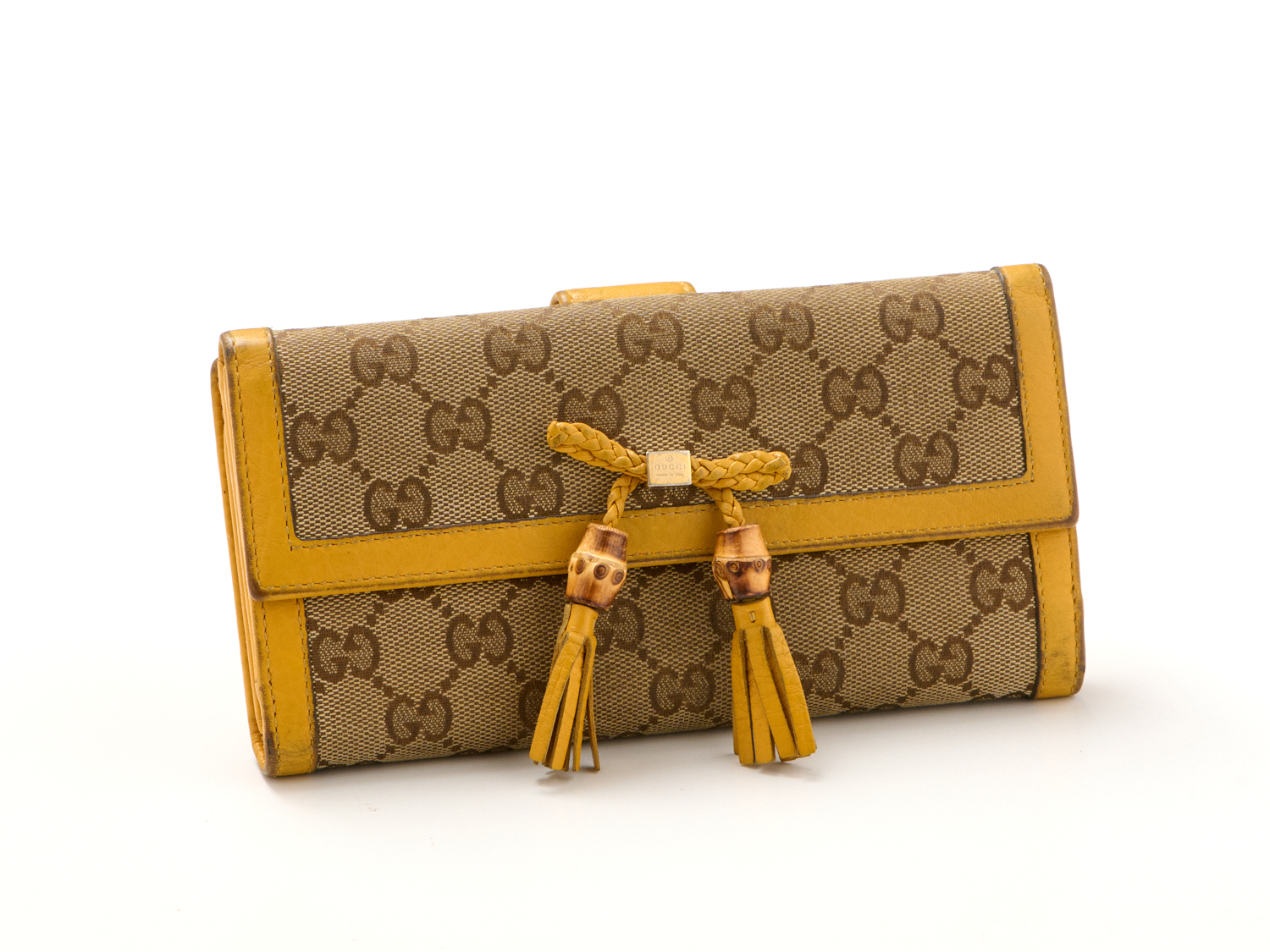 A LONG WALLET BY GUCCI - Styled in monogram canvas, with bamboo tassel detail and leather trim, 19 x 10cm.