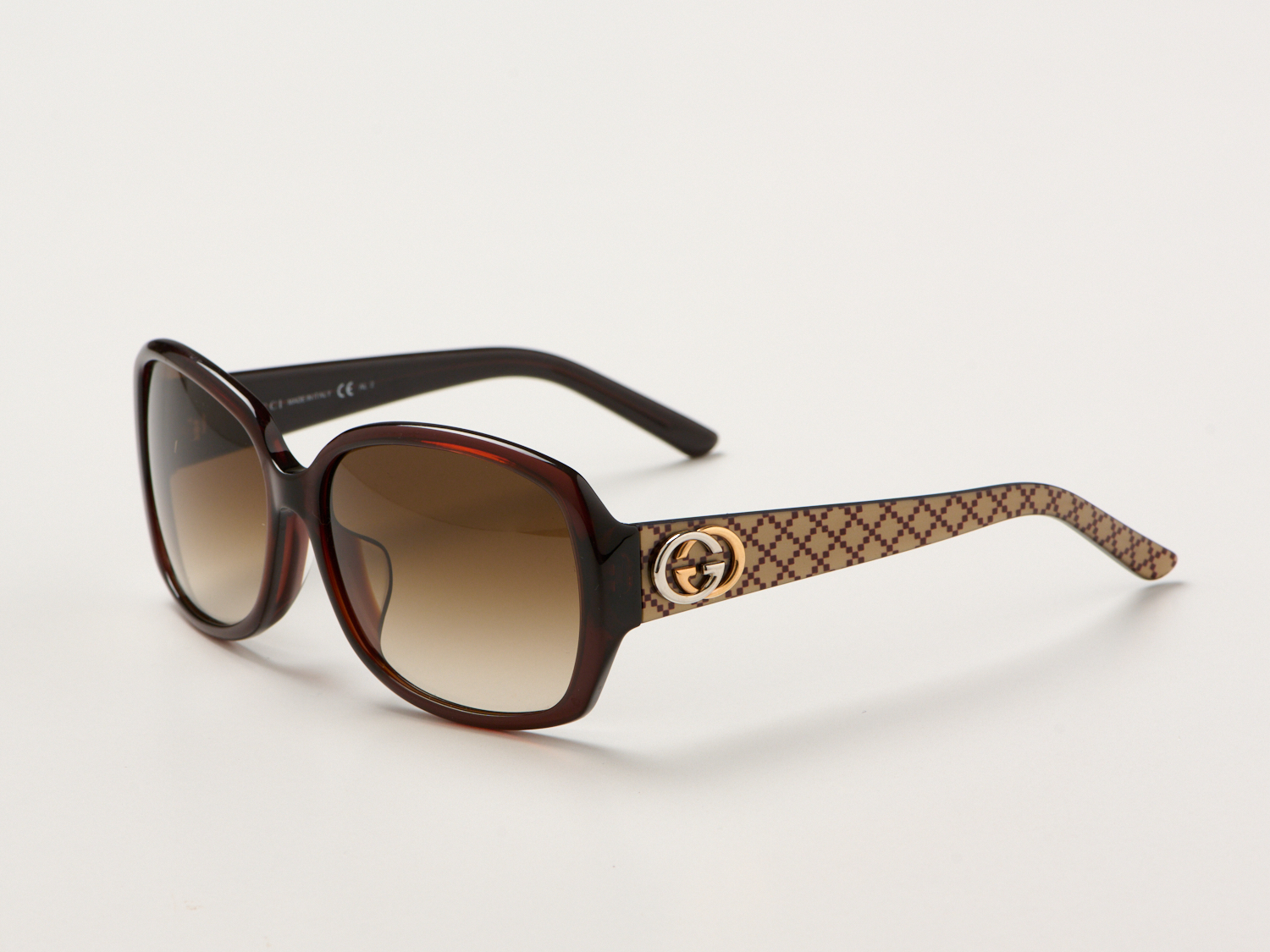 A PAIR OF SUNGLASSES BY GUCCI - The rounded frames styled in brown composite, with conforming gradient lenses, checkered arms and GG logo temples.
