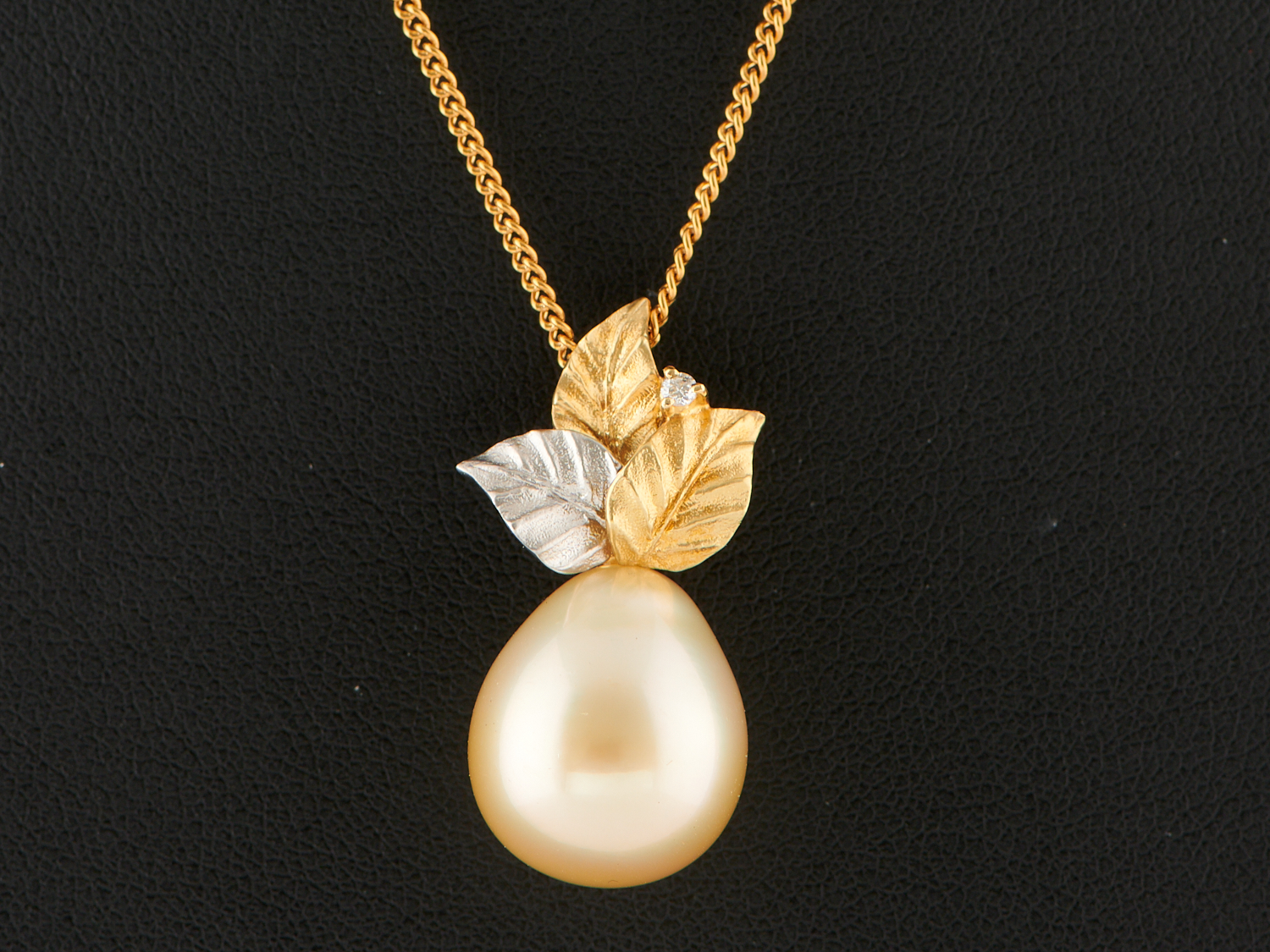 A SOUTH SEA PEARL TO A DIAMOND 'LEAF' ENHANCER IN 18CT TWO TONE GOLD, THE PEARL MEASURING 13.4 X 15MM