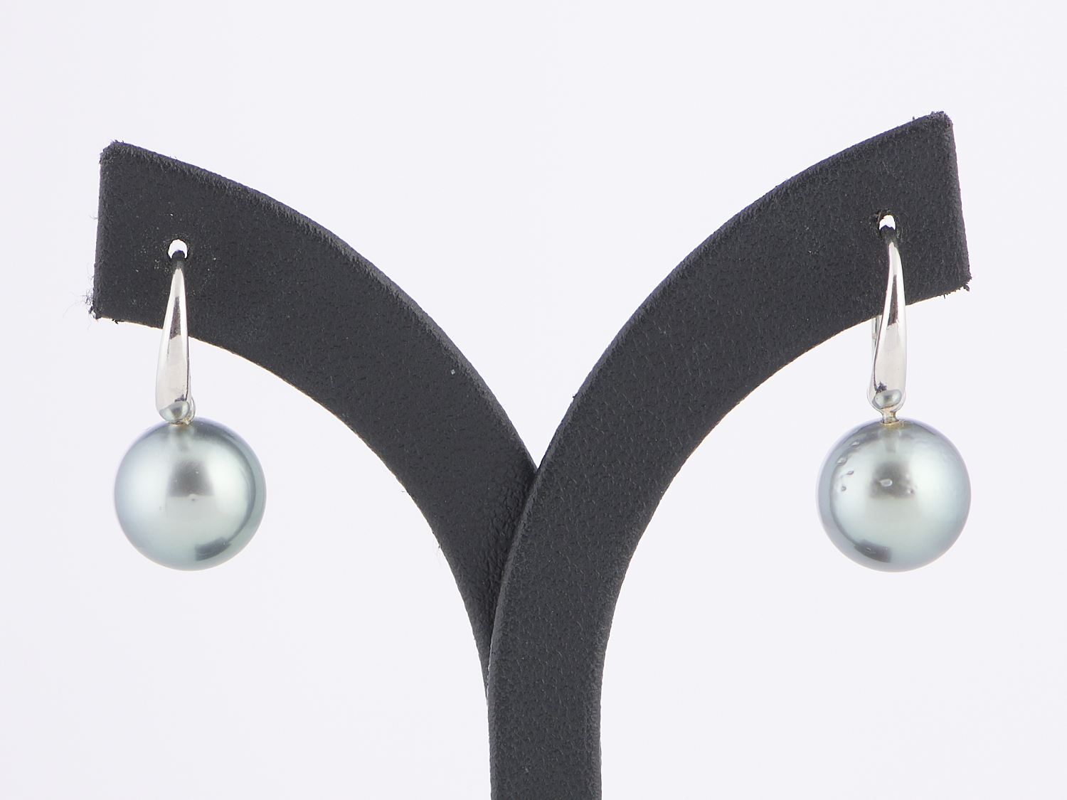 A PAIR OF TAHITIAN PEARL EARRINGS IN 9CT WHITE GOLD, TO SHEPHERD HOOK FITTINGS, THE ROUND PEARL MEASURING 10.5MM