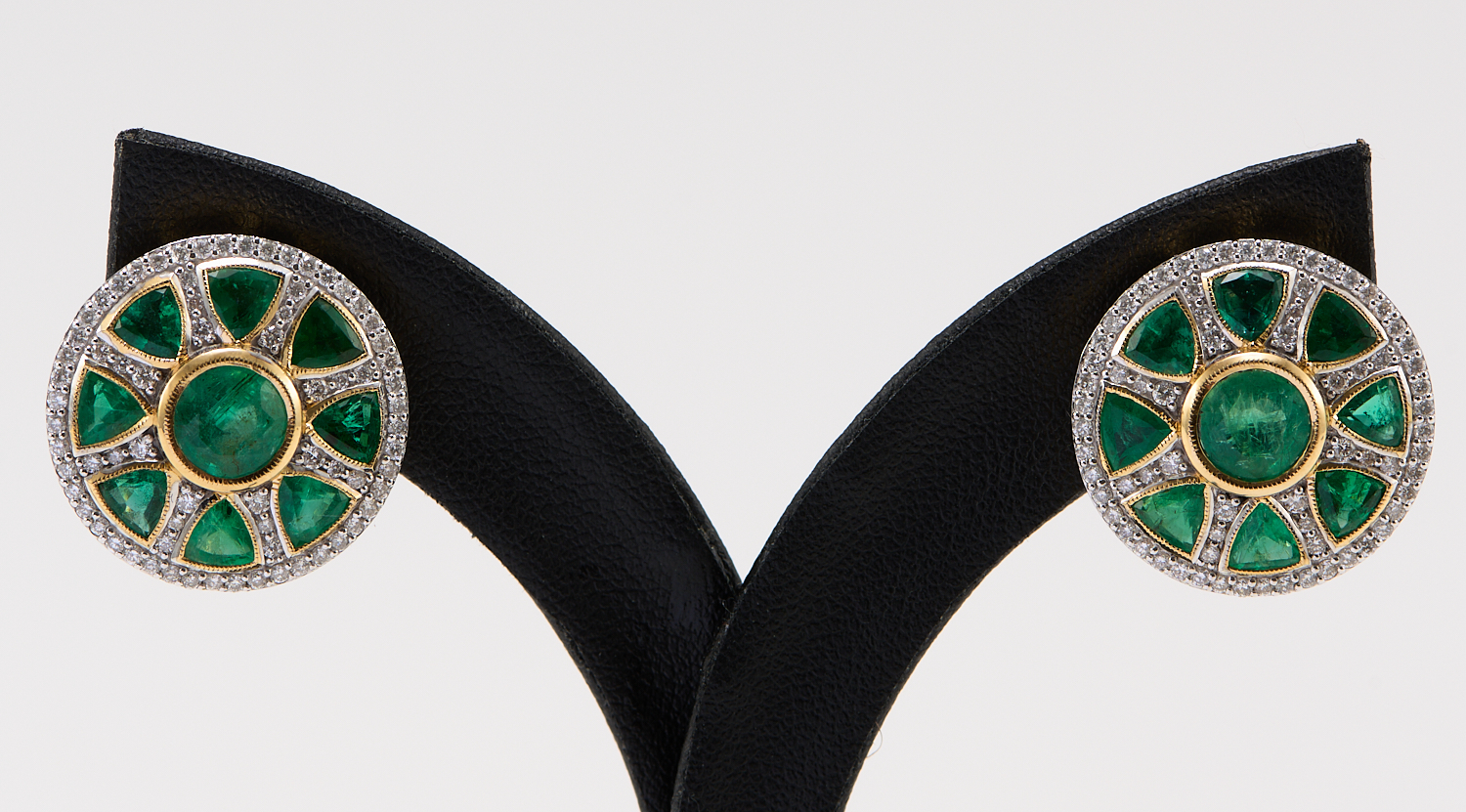 A PAIR OF EMERALD AND DIAMOND EARRINGS IN 18CT GOLD, THE EMERALDS TOTALLING 5.60CTS, THE DIAMONDS TOTALLING 0.96CTS, TO POST AND CLIP FITTINGS, DIAMETER 20MM
