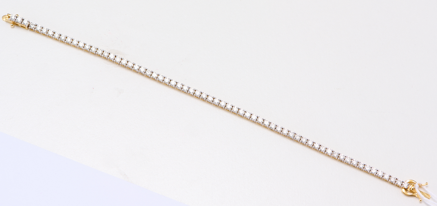 A DIAMOND SET LINE BRACELET IN 18CT GOLD, DESIGNED AS A CONTINUOUS LINE OF CLAW-SET BRILLIANT-CUT DIAMONDS TOGETHER WEIGHING 4.53 CARATS, COMPLETED BY A BOX CLASP, LENGTH 180MM