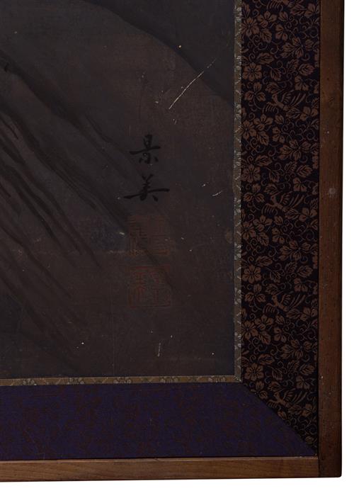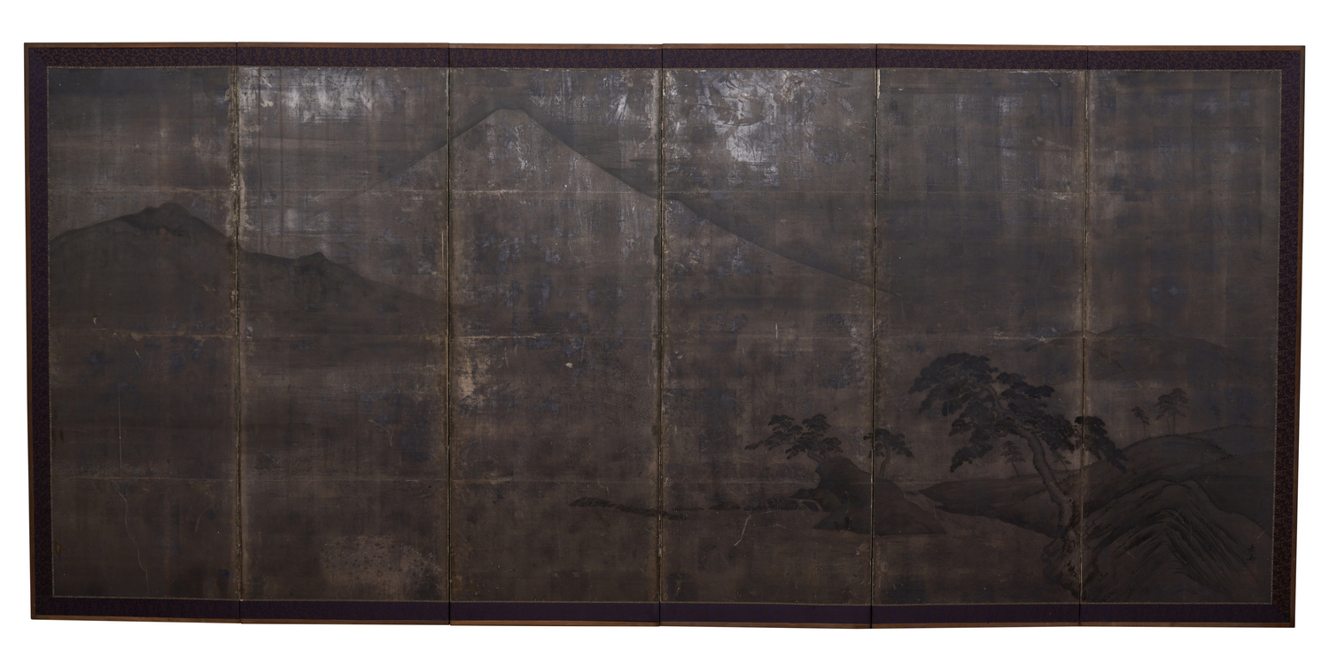 Expansive design of hills and pines overlooked by the mystical shape of Mount Fuji. The design worked in ink over patinated silver leaf and with signature of Akemi.