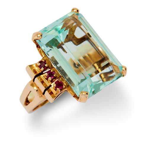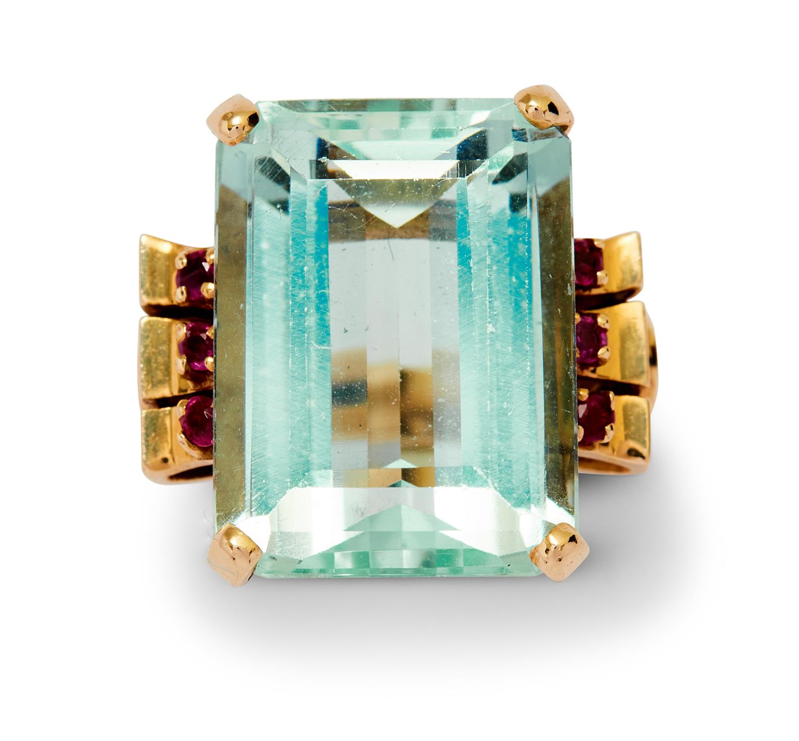 AQUAMARINE AND RUBY RING, CIRCA 1945