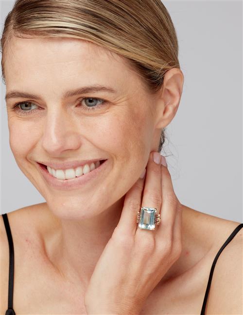 The rectangular emerald-cut aquamarine weighing approximately 18.00 carats, is claw-set between a line of three circular-cut rubies, mounted in 14ct gold, size M.