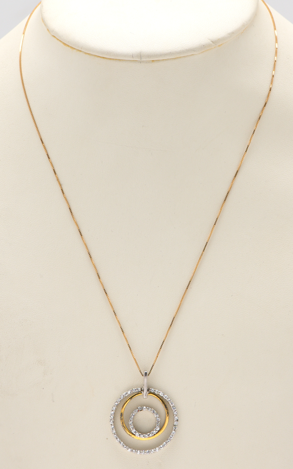 A WHITE STONE PENDANT IN STERLING SILVER (DIAMETER 27MM), TO A FINE TRACE CHAIN IN 14CT GOLD