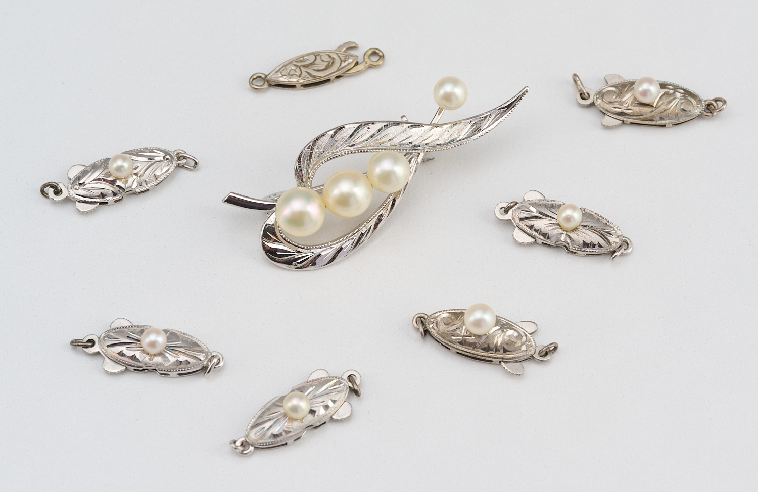 A COLLECTION OF EIGHT PEARL SET FINDINGS IN SILVER, INCLUDING A PEARL BROOCH AND PEARL CLASPS